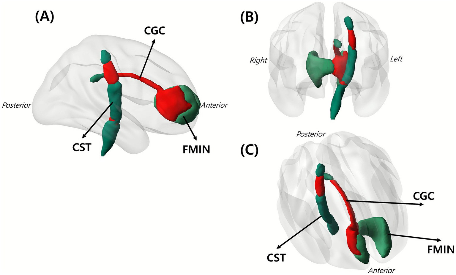 Overlap of white matter tracts with the identified symptom-related lesions. Red area indicates the spatial intersection between lesions and major white matter tracts, demonstrating where CRPS-related lesions involved specific tracts. Shown are (A) sagittal view, (B) coronal view, and (C) lateral oblique view of the left hemisphere. The figure involves three key tracts: CGC, CST, and FMIN. CGC, cingulum in the cingulate gyrus; CST, corticospinal tract; FMIN, forceps minor.