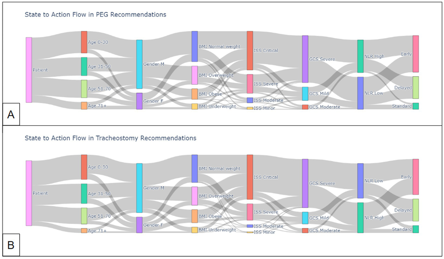 State-to-action flow by Q-learner for (A) PEG recommendations and (B) trach recommendations.