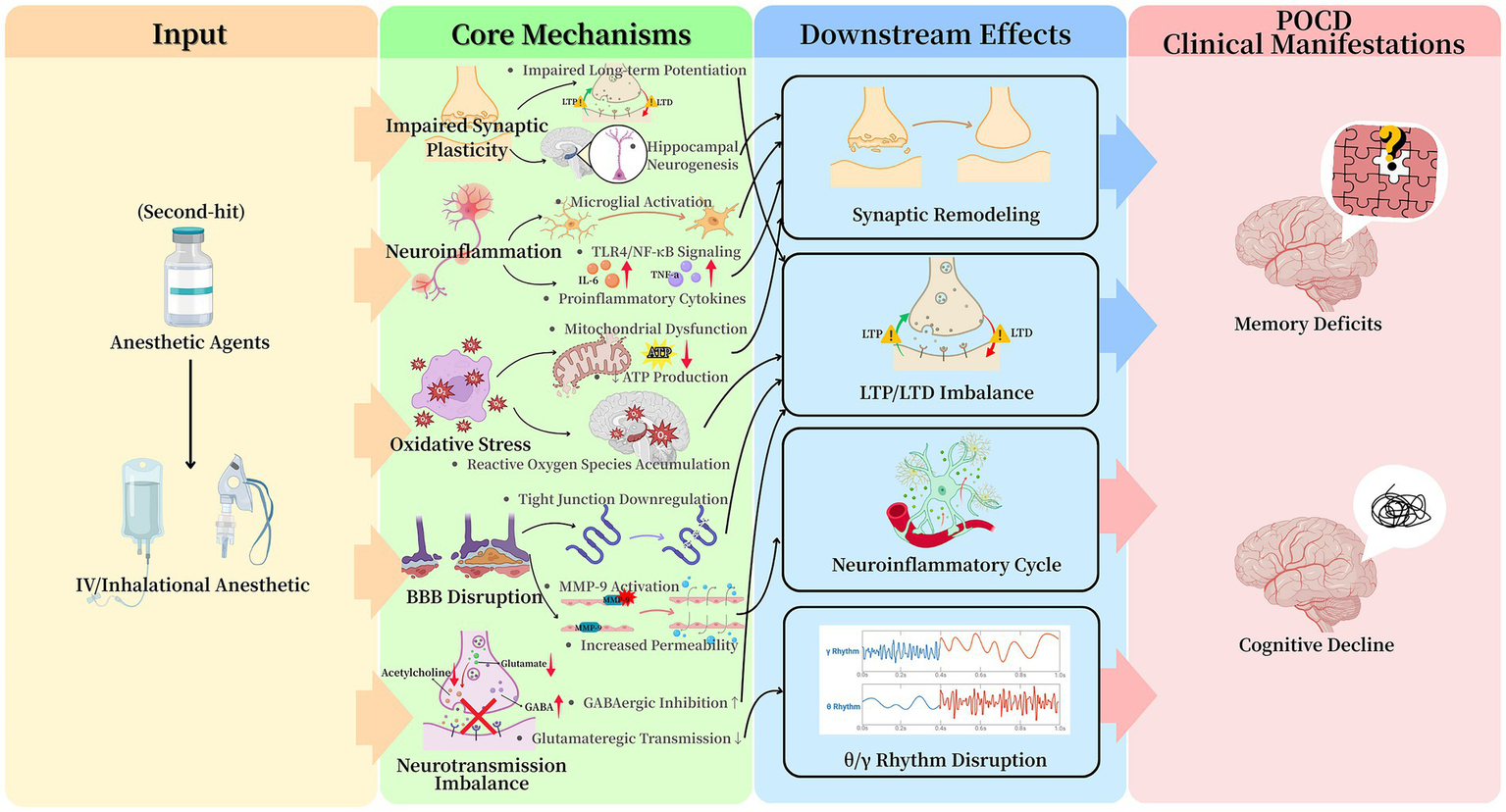 In summary, this perspective analyses anesthesia’s role in POCD pathogenesis through the unifying “two-hit” model, wherein perioperative insults amplify pre-existing neural vulnerability. We have integrated evidence highlighting three interconnected mechanistic pillars: neuroinflammatory activation, mitochondrial dysfunction with oxidative injury, and impaired synaptic plasticity. Central to our analysis is that the synergistic interaction among these pathways—not their isolated effects—drives the cognitive impairment characteristic of POCD. This synthesis further demonstrates that anesthesia contributes to POCD through three established pathways—microglia-mediated neuroinflammatory activation, disturbances in cerebral hemodynamics and metabolic homeostasis, and direct impairment of synaptic plasticity and neurogenesis. Together, these mechanisms produce a neurobiological milieu that promotes cognitive impairment extending beyond the immediate postoperative period.