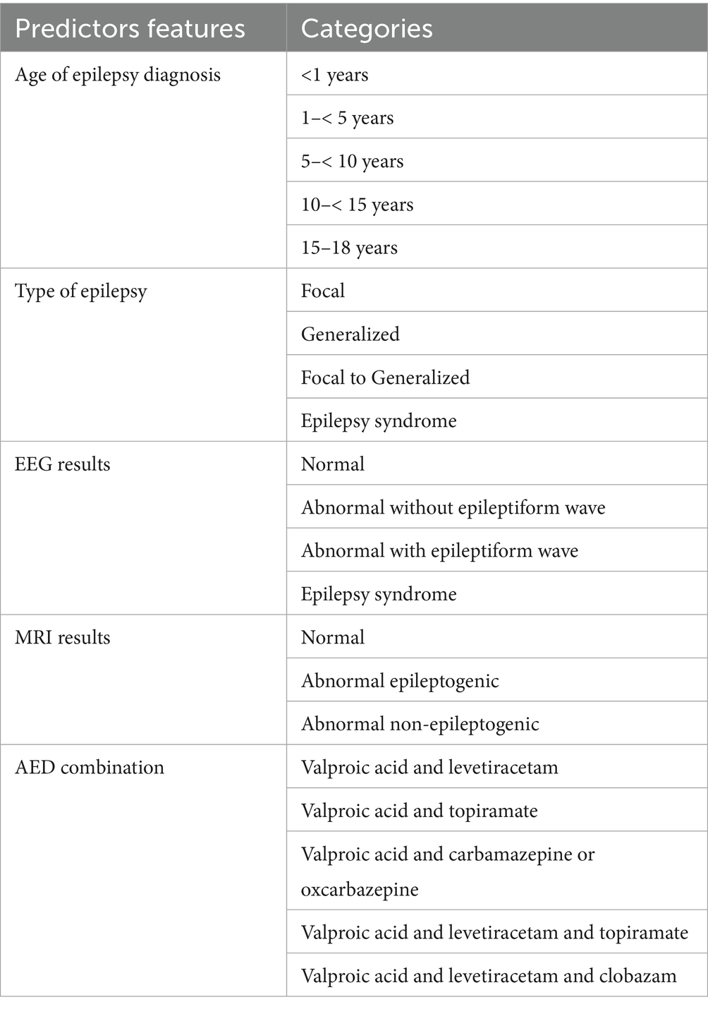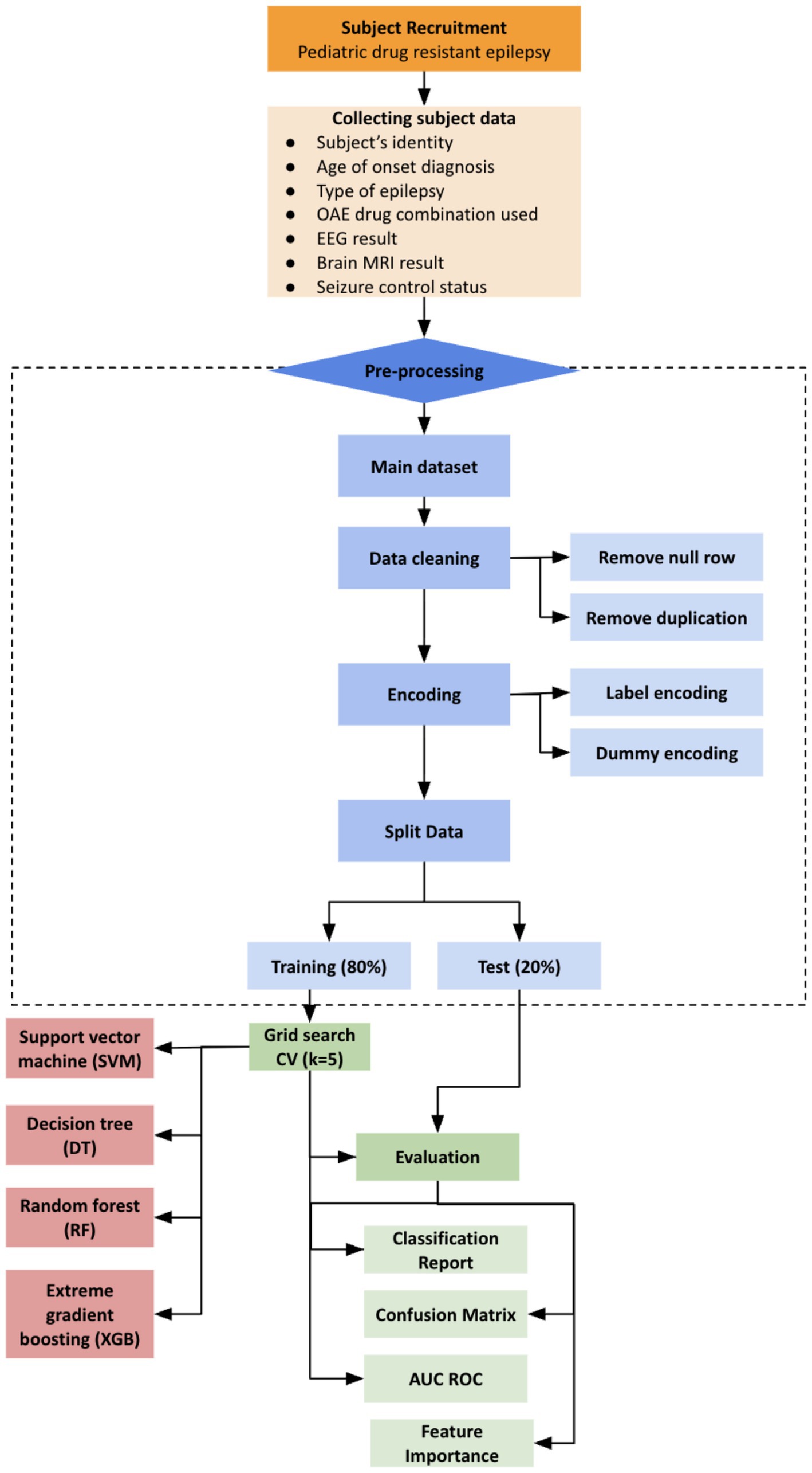 The use of AI has grown rapidly in medicine, especially in epilepsy (9–13). Machine learning (ML) is a part of AI which utilizes learning features to build systems that can learn and improve their performance based on the provided data (14, 15). The use of ML in the field of epilepsy has great potential and has been used to predict outcomes in several studies (9). This approach can integrate various patient’s data and analysis results into one platform. As of now, in Indonesia, there is still no use of AI to predict treatment success in pediatric patients with drug-resistant epilepsy. This study aims to develop machine learning models to predict treatment success in pediatric drug-resistant epilepsy, which may assist pediatric neurologists in making clinical decisions regarding patient’s seizure control status.