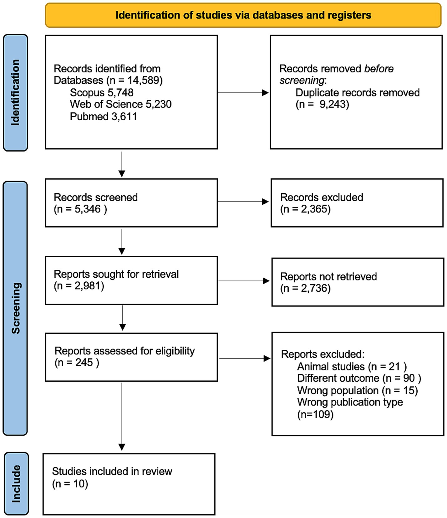 Following removal of duplicates, a total of 5,346 records were identified through database searches and screened for eligibility. Of these, 245 full-text articles were assessed, and 10 studies met the inclusion criteria for this systematic review. The study selection process is detailed in the PRISMA flow diagram (Figure 1).