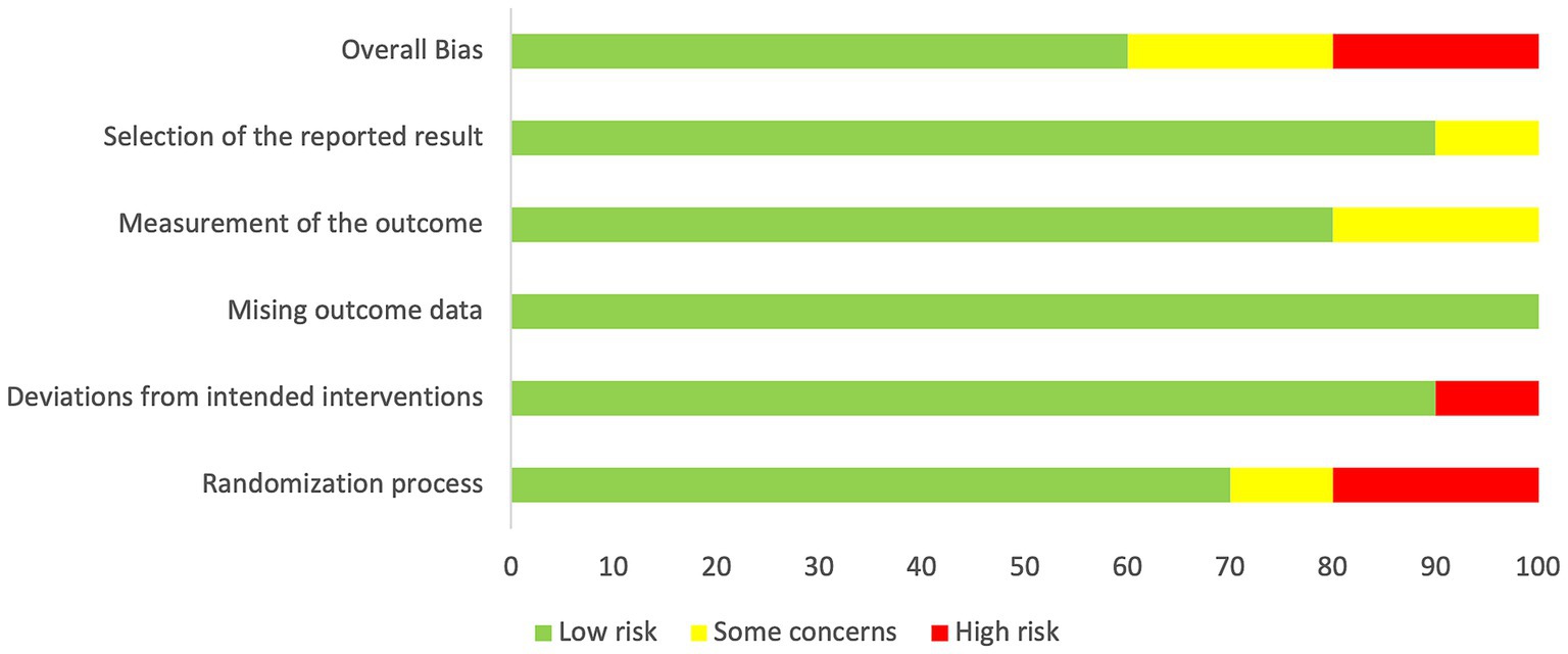 The risk of bias of included studies was evaluated using the Cochrane Risk of Bias tool version 2.0 (RoB-2) (12), which assesses five domains: (A) bias arising from the randomization process, (B) deviations from intended interventions, (C) missing outcome data, (D) outcome measurement, and (E) selection of the reported result. Risk levels were categorized as follows: “high risk” if at least one domain was rated high; “some concerns” if one or more domains raised concerns but none were rated high; and “low risk” if all domains were rated as low risk.