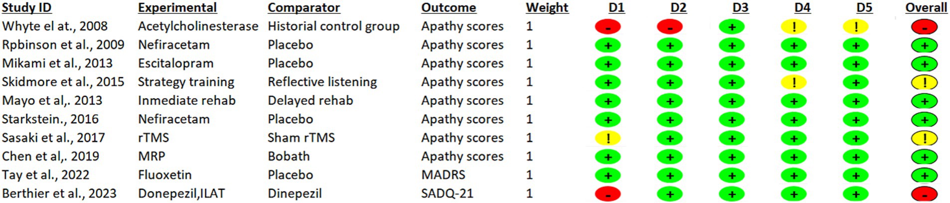 Among non-pharmacological strategies, MRP (19), strategy training (21), EBP (22), and rTMS (23) demonstrated improvements in apathy outcomes. However, small sample sizes and varied methodologies limit generalizability.
