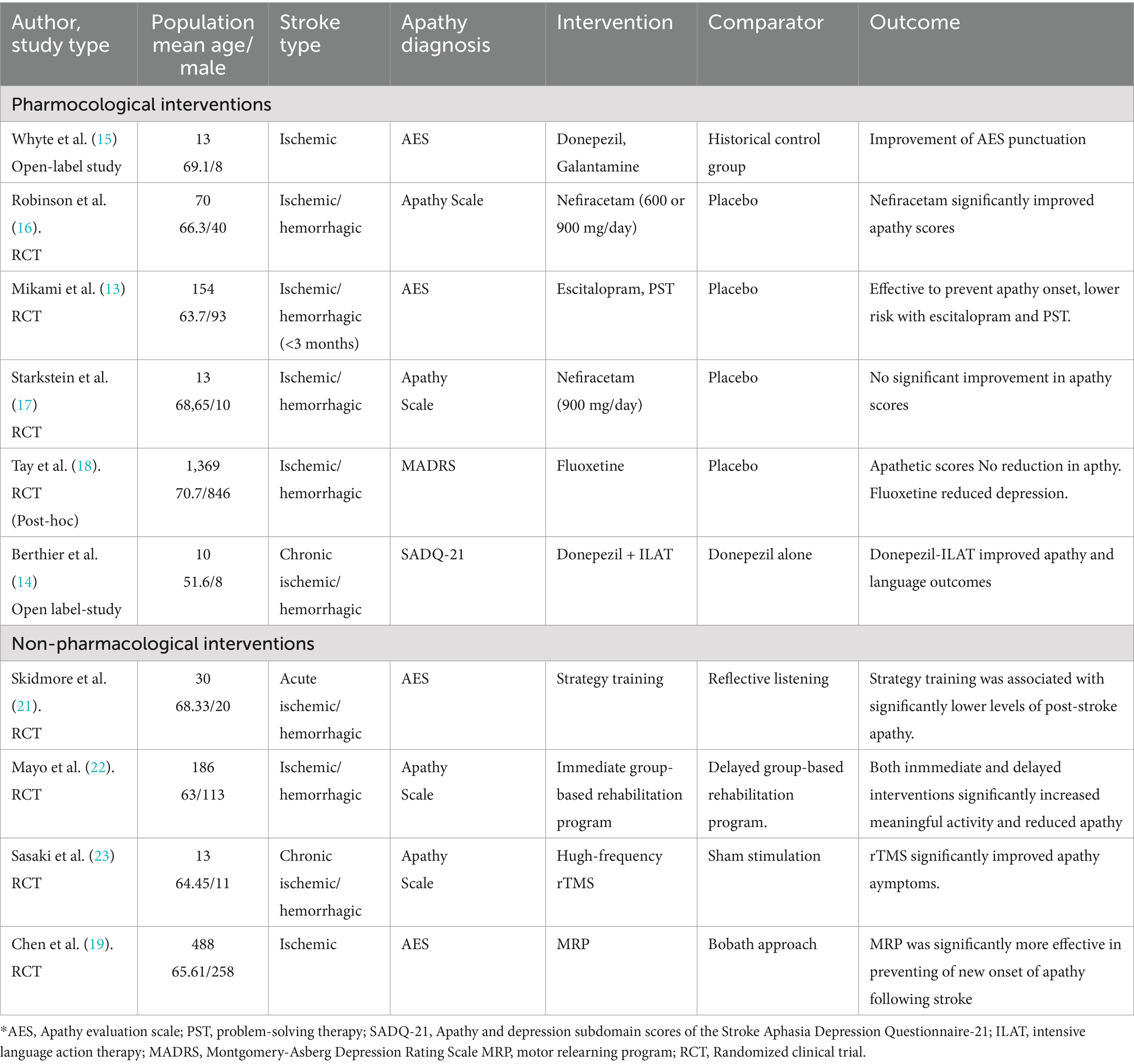 Conclusion: Several interventions, including escitalopram, donepezil, motor relearning programs, strategy training, and rTMS, have demonstrated potential effectiveness in treating post-stroke apathy. Nevertheless, evidence remains scarce and heterogeneous, underscoring the need for larger, high-quality randomized controlled trials to establish definitive treatment guidelines.