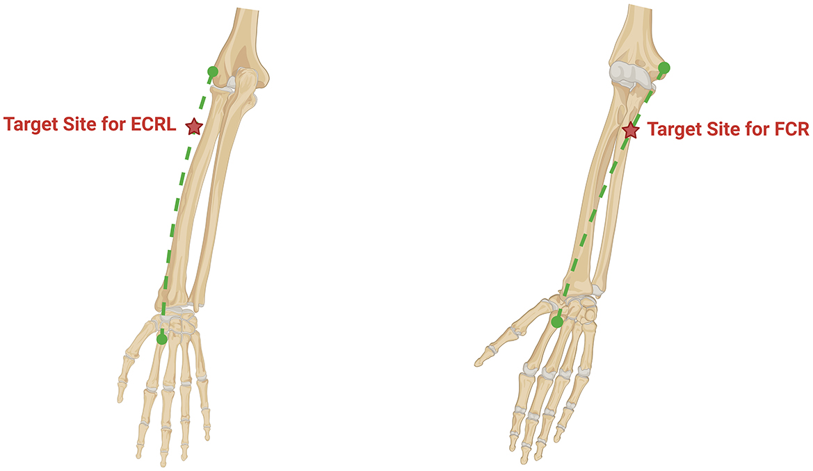 Figure 2. An anatomical figure for targeting landmarks. Left image: The target muscle is the extensor carpi radialis longus. Its origin is the lateral epicondyle, and its insertion is the dorsal surface of the base of the second metacarpal bone, connected by the green dashed line. The red five-pointed star indicates the stimulation point location, which is 4 cm distal to the lateral epicondyle. Right image: The target muscle is the Flexor Carpi Radialis. Its origin is the medial epicondyle, and its insertion is the palmar surface of the base of the second metacarpal bone, connected by the green dashed line. The red five-pointed star indicates the stimulation point location, which is 5 cm distal to the medial epicondyle.