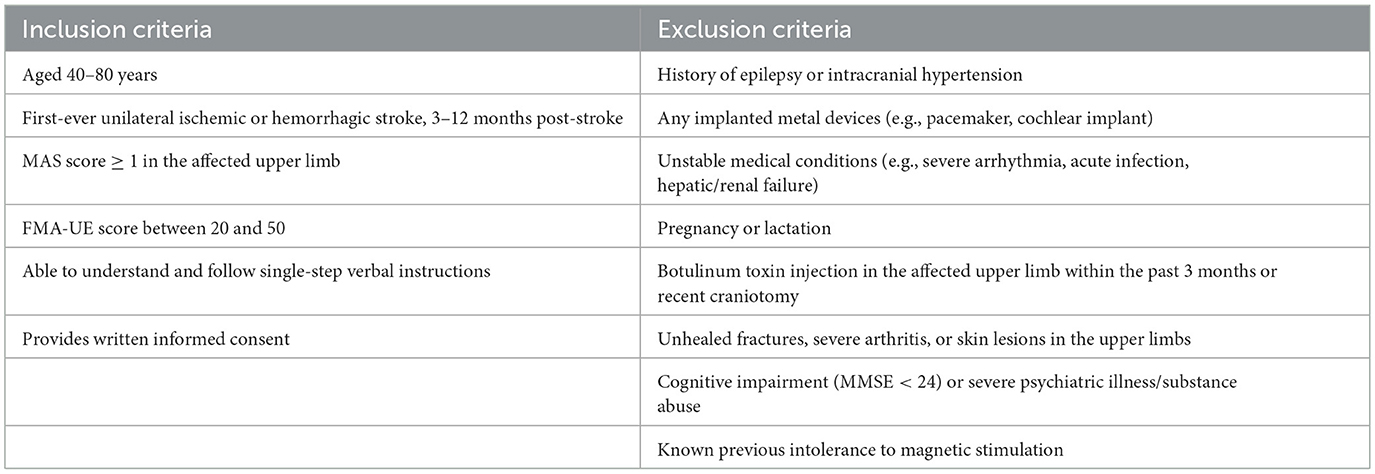 We will recruit adults aged 40–80 years who sustained their first-ever unilateral ischemic or hemorrhagic stroke 3–12 months earlier, as confirmed by Computed Tomography/Magnetic Resonance Imaging and classified according to World Health Organization or International Classification of Diseases criteria. Participants must present with moderate upper-limb —impairment defined as a MAS score ≥ 1 or a Fugl-Meyer Upper Extremity score between 20 and 50 and be able to understand and follow single-step verbal instructions. All subjects must sign written informed consent. Individuals will be excluded if they have epilepsy, intracranial hypertension, or any implanted metal devices; unstable medical conditions such as severe arrhythmia, acute infection, or hepatic/renal failure; pregnancy or lactation; recent (past 3 months) craniotomy, botulinum-toxin injections, or high-dose centrally acting antispasmodics; unhealed fractures, severe arthritis, or skin lesions in the upper limbs; cognitive impairment (Mini-Mental State Examination < 24) or severe psychiatric illness/substance abuse; or previous intolerance to magnetic stimulation (Table 2).