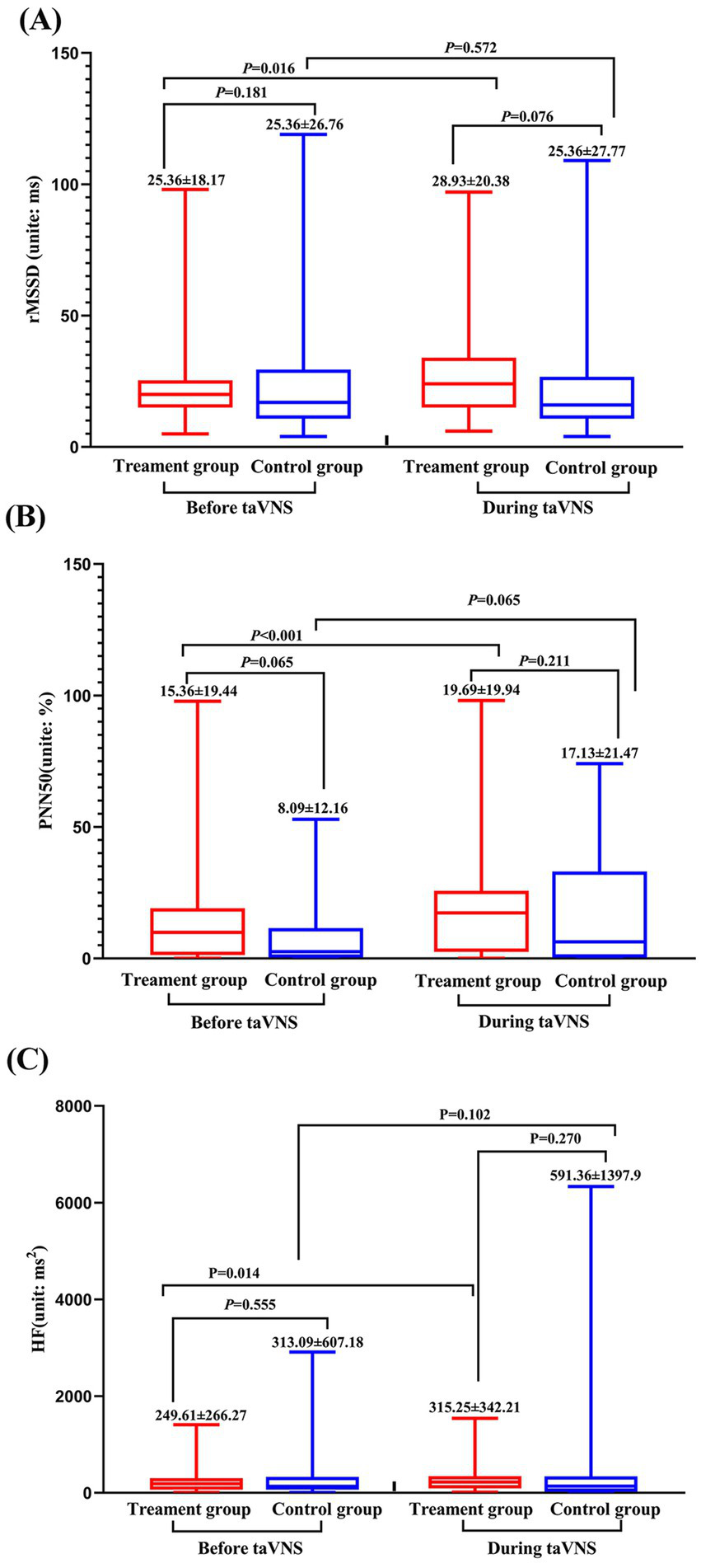 An echocardiography (ECG) device (ECG-3303B, Guangdong Medical; registration number: 20182070863) and an information management system from Guangzhou Sanrui Electronic Technology Co., Ltd. were used to record and analyze the 5-min ECG and HRV data of the patients before and after taVNS treatment.