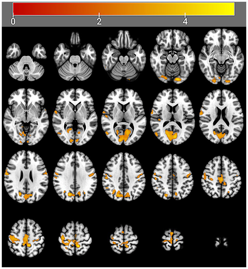 The resting-state fMRI data preprocessing was performed using RESTplusV1.28 (developed by Prof. Yufeng Zang’s team at Hangzhou Normal University Affiliated Hospital) and SPM V12.0 (developed by University College London) based on MATLAB (The Math Works, Natick, MA, United States) (40, 41). For each subject, the data were processed by the following eight steps: (1) Convert the functional magnetic resonance imaging (fMRI) data from DICOM format to NIFTI format. (2) the images corresponding to the first 10 time points were removed for magnetization equilibrium, and the other 230 volumes were used for further analysis; (3) slice-timing correction was conducted to adjust the acquisition time delay between slices; (4) realignment of head motion: images demonstrating translations in the x, y, or z direction exceeding 3 mm and rotations exceeding 3° were eliminated. (5) The functional data were subsequently registered to high-definition T1 structural phase images and normalized with the Diffeomorphic Anatomical Registration Through Exponential Lie (DARTEL) method. Then, the normalized functional images were resampled to Montreal Neurological Institute (MNI) space, resampled to a 3-mm isotropic resolution; (6) smooth the resampled data with a Gaussian kernel at a full width at half maximum of 6 × 6 × 6 mm. (7) The 24-head motion parameters, white matter signals, and cerebrospinal fluid signals were linearly regressed via a generator, and linear trends were removed from the fMRI data. (8) The ALFF values obtained by squaring the power spectrum of the signal from 0.01 Hz to 0.08 Hz. The mALFF was subsequently obtained by dividing the ALFF values by their mean.