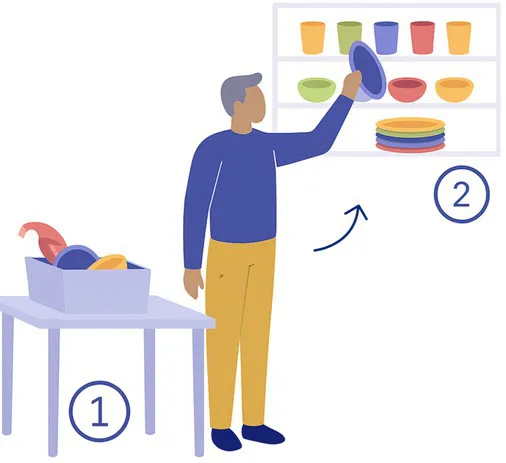 | 4-Sorting | The participant sorts plastic dishes from a storage box into a shelving unit according to color and size.![]() |