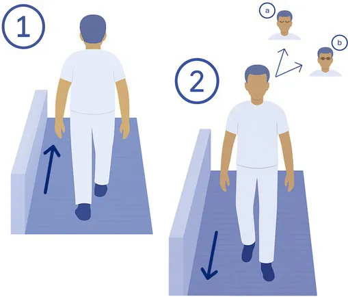 Ground elevation (2 sets of 15 degrees elevation over 2 meters) | Modification of feet proprioception Absence of visual inputs |