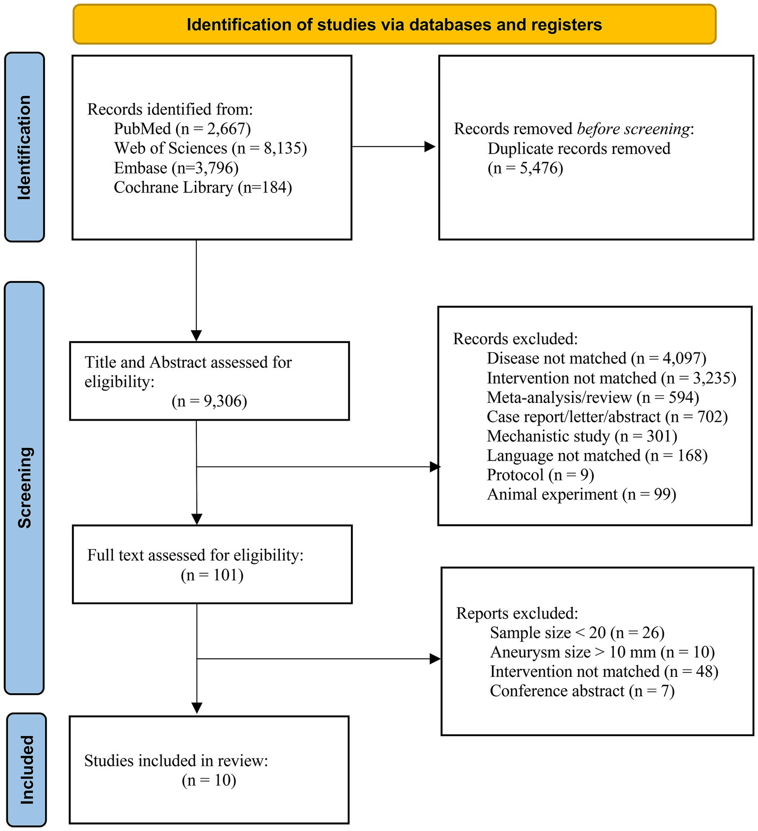 From 14,782 records, 5,476 duplicates were removed, leaving 9,306 for screening. After excluding 9,205 based on titles/abstracts, 101 full texts were assessed, and 10 studies met inclusion criteria (shown in Figure 1).