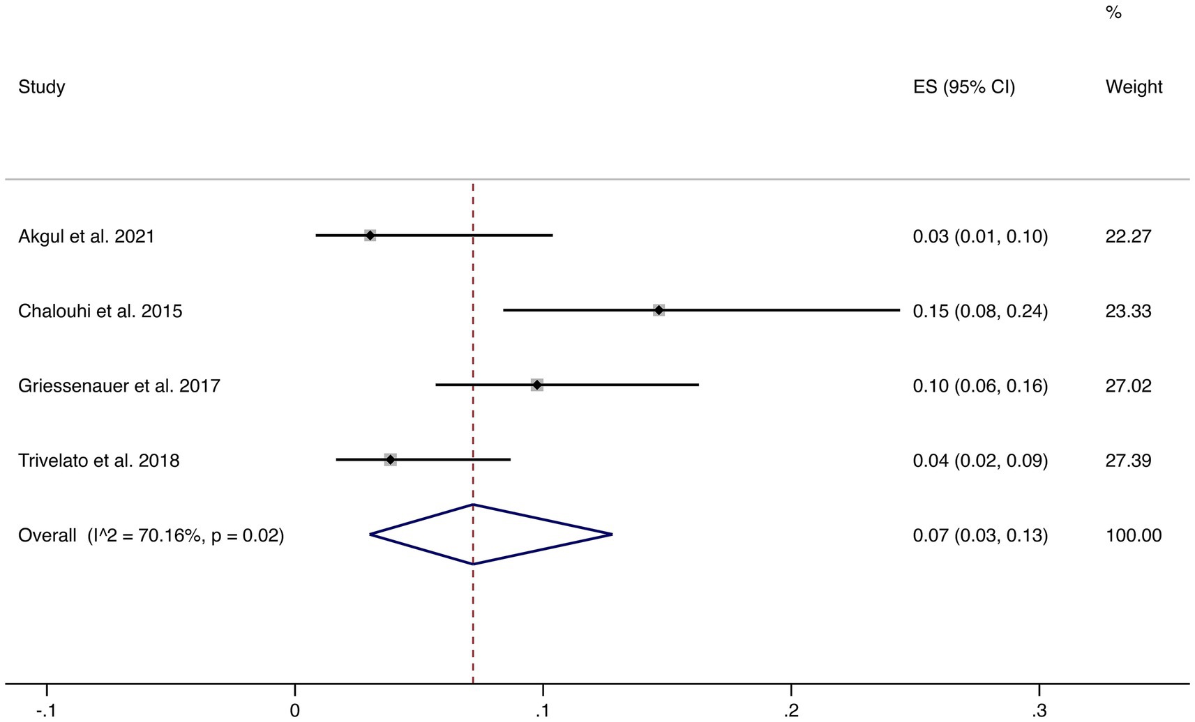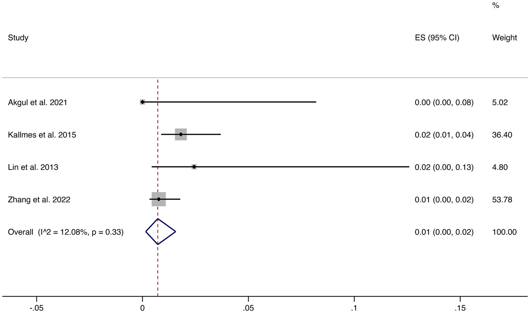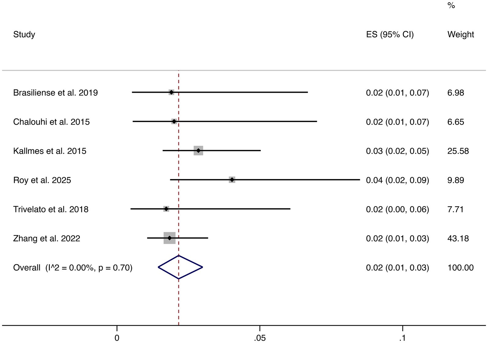 Seven studies reported hemorrhagic complications. The pooled rate was 1% (95% CI: 1–2%), with very low heterogeneity (I2 = 2.70%, p = 0.40), indicating highly consistent findings across studies. These results confirm that hemorrhagic risk following FD treatment is low (shown in Figure 5).