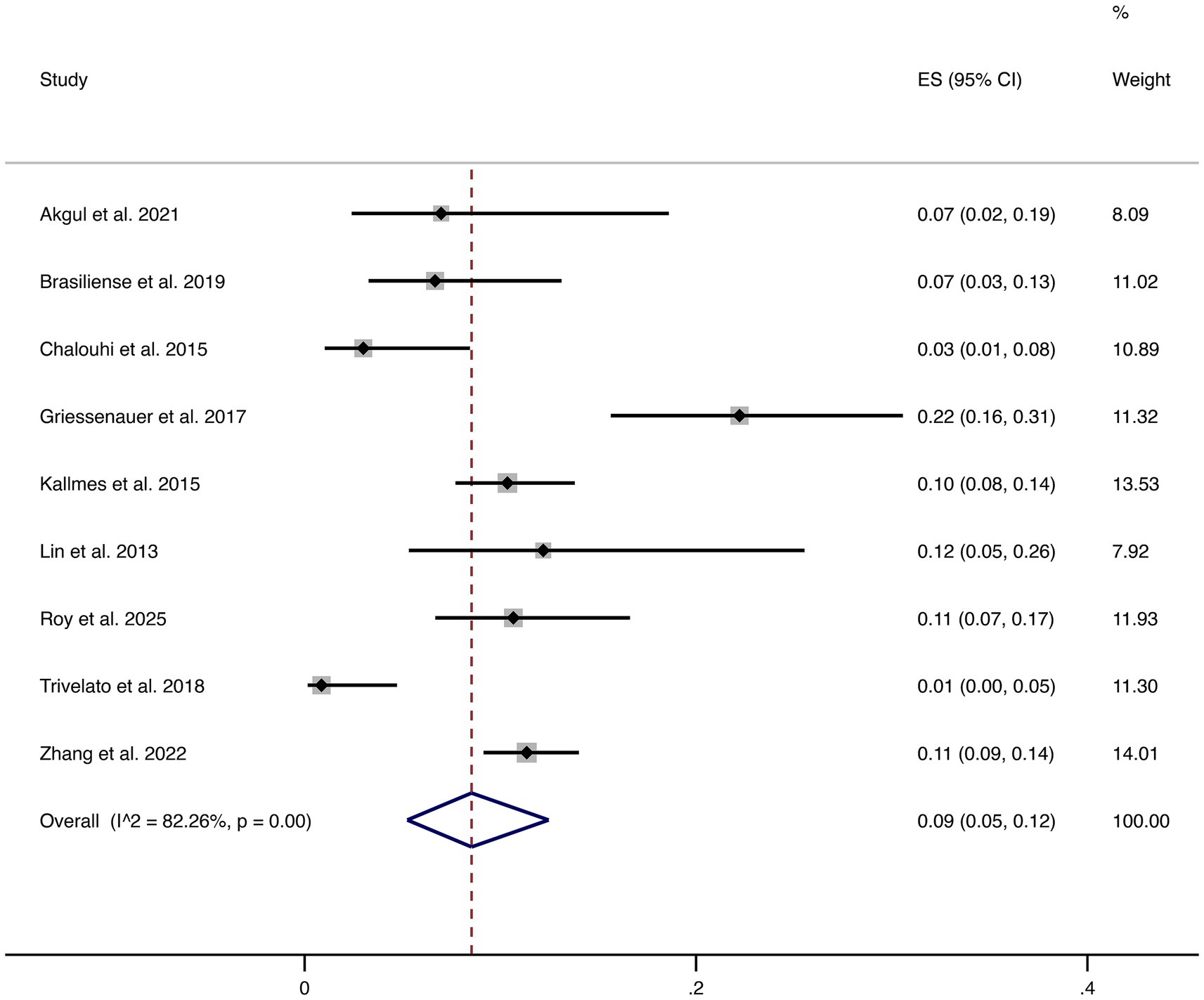 Analyses were performed using Stata 15.0. Outcomes were expressed as proportions, and pooled using single-arm meta-analysis. To stabilize variance, the Freeman–Tukey double arcsine transformation was applied. Pooled estimates with 95% CIs were reported. Heterogeneity was assessed with Cochran’s Q test and the I2 statistic; random-effects models (DerSimonian–Laird) were applied when I2 > 50%, otherwise fixed-effects models were used. Publication bias was assessed with funnel plots and Egger’s test.
