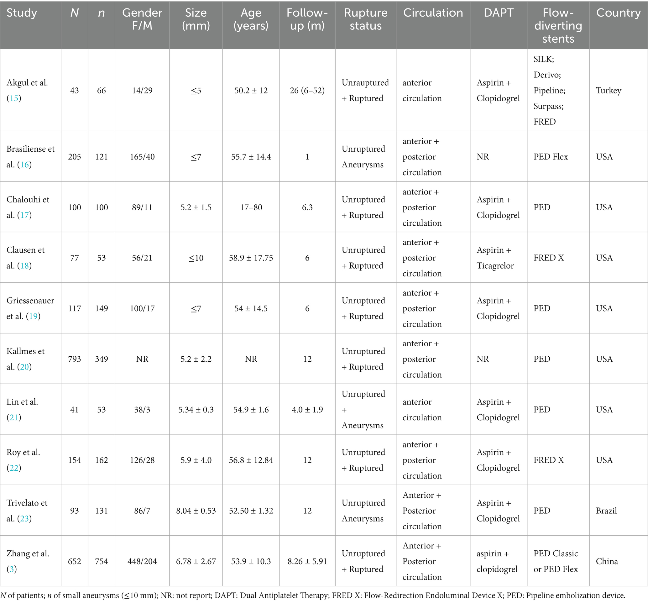 The 10 retrospective studies (3, 15–23) included 2,275 patients with 1,938 SIAs. Five studies used PED, two FRED X, one PED Flex, and two reported mixed FD devices (SILK, Derivo, Surpass). Studies were conducted in the United States, Turkey, China, and Brazil. Study characteristics are summarized in Table 1.