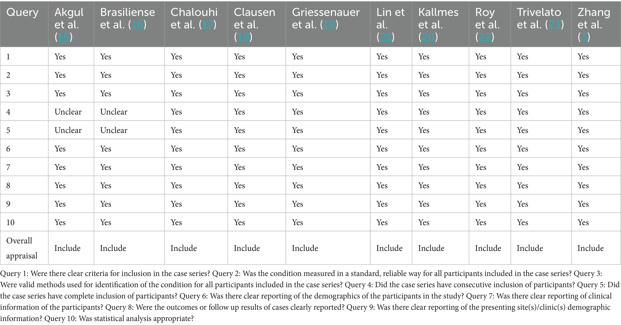 14. Munn, Z, Barker, TH, Moola, S, Tufanaru, C, Stern, C, Mcarthur, A, et al. Methodological quality of case series studies: an introduction to the Jbi critical appraisal tool. Jbi Evid Synth. (2020) 18:2127–33. doi: 10.11124/JBISRIR-D-19-00099