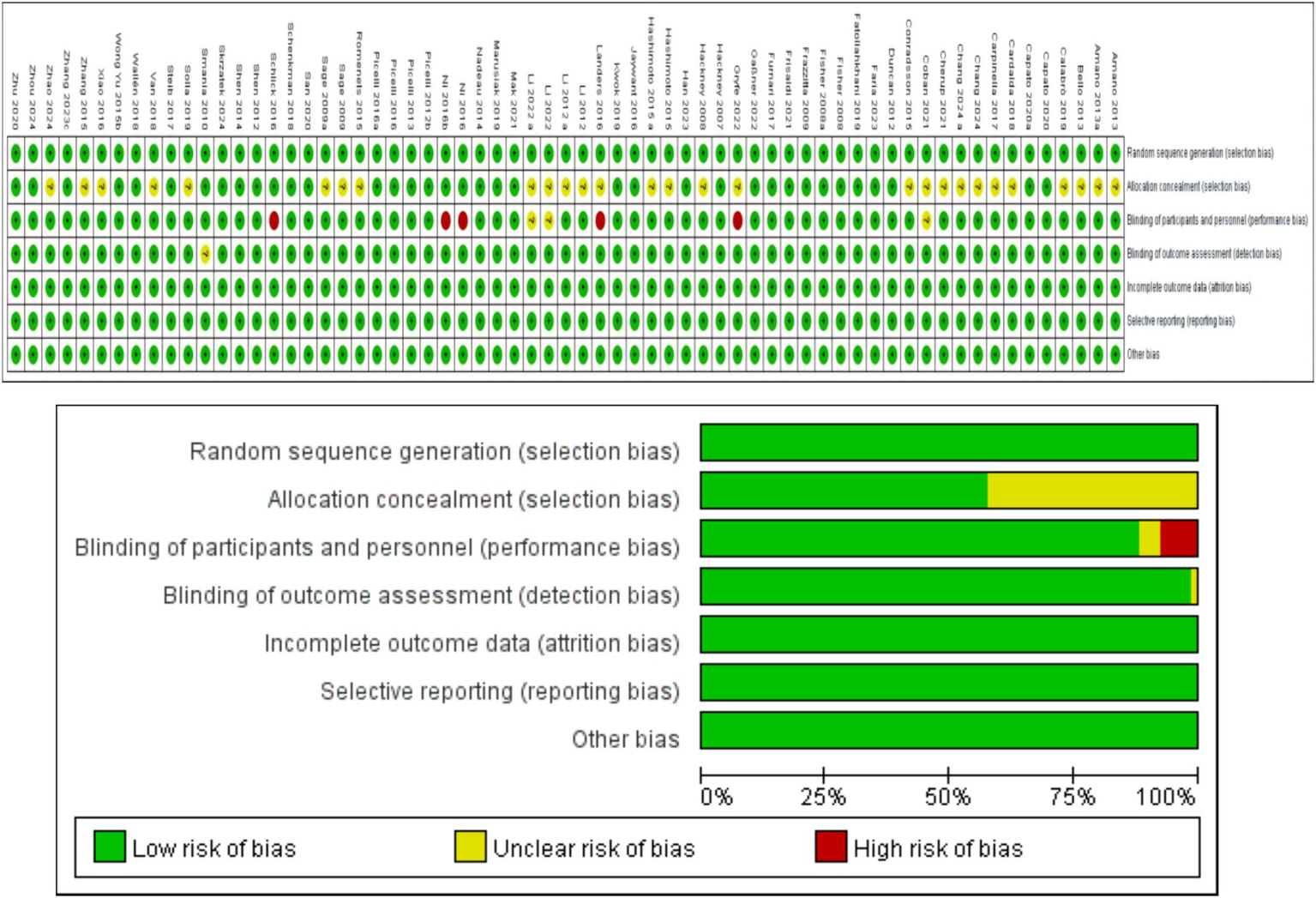 The data (Figure 2) show that among the 64 RCTs, 64 mentioned random allocation; 36 stated allocation concealment; 56 reported blinding of outcome assessment; 63 articles indicated a low risk of selective reporting; and 64 had no other biases. In summary, 36 were judged to have a low risk of bias.