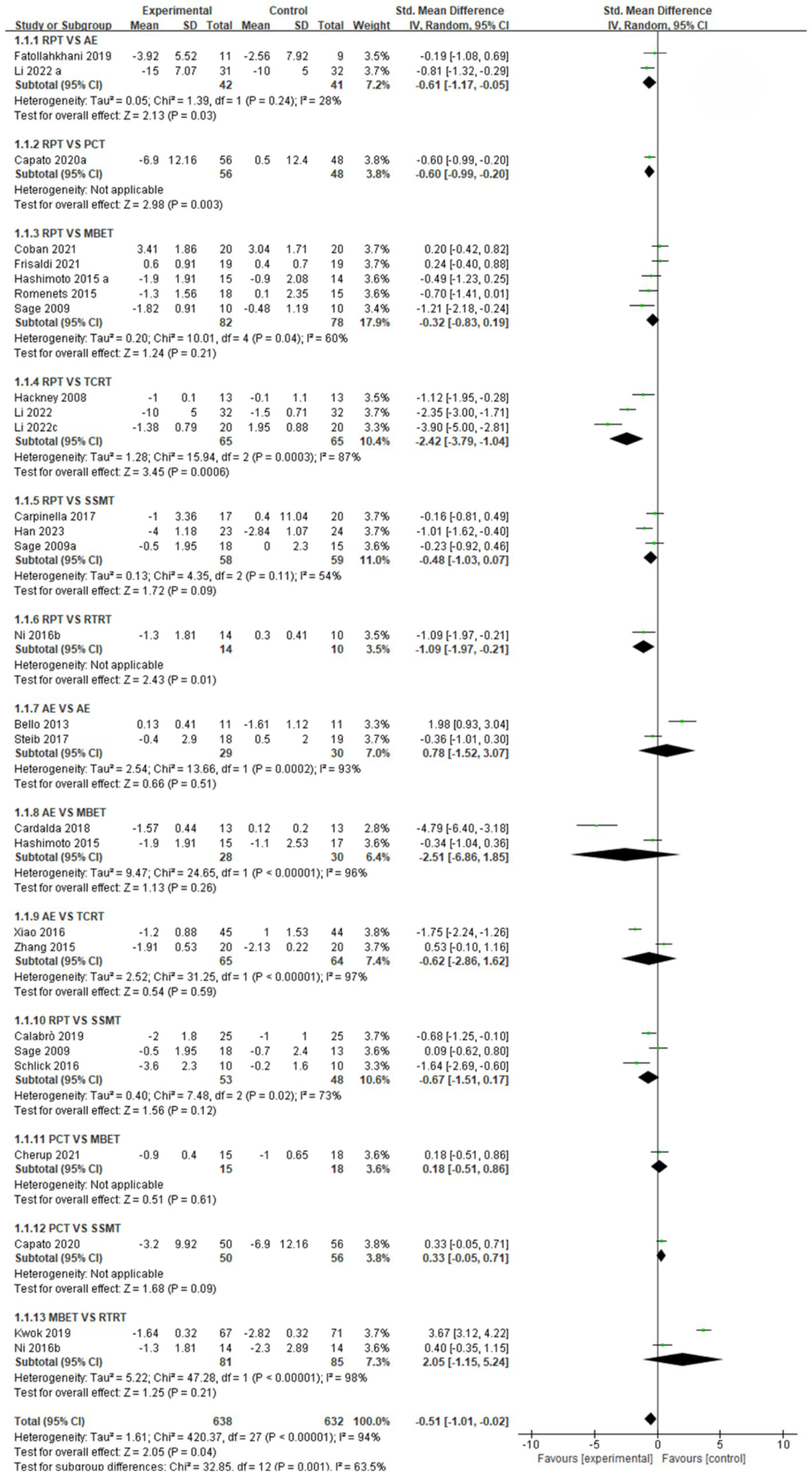 Postural control indicators (Figure 5): A comparative analysis of different intervention measures showed the following. The RPT vs. AE comparison showed a pooled effect size SMD = −1.27 (95% CI [−1.54, −0.99], p < 0.05, I2 = 95%). Heterogeneity testing indicated extremely high heterogeneity among studies, with a statistically significant difference in intervention effects, suggesting AE was more effective than RPT in improving postural control. The comparison between RPT and PCT showed a pooled effect size SMD = −4.16 (95% CI [−8.77, 0.44], p = 0.08), indicating no statistically significant difference in intervention effects. The comparison between RPT and MBET showed a pooled effect size SMD = −2.35 (95% CI [−3.27, −1.43], p < 0.05, I2 = 85%), indicating a statistically significant difference in intervention effects, with MBET superior to RPT in improving postural control. The comparison between RPT and TCRT showed a pooled effect size SMD = −4.71 (95% CI [−5.63, −3.79], p < 0.05, I2 = 91%). The heterogeneity test indicated extremely high heterogeneity among studies, with a statistically significant difference in intervention effects, suggesting TCRT was superior to RPT. The comparison analysis between RPT and TCRT showed a pooled effect size SMD = −4.71 (95% CI [−5.63, −3.79], p < 0.05, I2 = 91%). The heterogeneity test indicated extremely high heterogeneity among studies, with a significant statistical difference in intervention effects. TCRT was significantly superior to RPT in improving postural control. The comparison analysis between RPT and SSMT showed a pooled effect size SMD = −0.01 (95% CI [−0.30, 0.28], p > 0.05, I2 = %). The heterogeneity test indicated minimal heterogeneity among studies, with no significant statistical differences in intervention effects. RPT and SSMT were equally effective in improving postural control. The comparison analysis between AE and MBET showed a pooled effect size SMD = −18.70 (95% CI [−27.95, −9.45], p < 0.05), indicating a significant statistical difference in intervention effects. MBET was significantly more effective than AE in improving postural control. The comparison analysis between AE and TCRT showed a pooled effect size SMD = −1.20 (95% CI [−2.23, −0.16], p < 0.05, I2 = 86%). The heterogeneity test indicated extremely high heterogeneity among studies, with significant statistical differences in intervention effects. TCRT was significantly superior to AE in improving postural control. The comparison analysis between AE and SSMT showed a pooled effect size SMD = −1.97 (95% CI [−3.62, −0.31], p < 0.05, I2 = 0%), indicating significant statistical differences in intervention effects. SSMT was significantly superior to AE in improving postural control. The comparison analysis between PCT and SSMT showed a pooled effect size SMD = −4.20 (95% CI [−4.53, −3.87], p < 0.05), indicating a significant statistical difference in intervention effects. SSMT was significantly more effective than PCT in improving postural control. The comparison analysis between PCT and RTRT showed a pooled effect size SMD = 3.90 (95% CI [1.93, 5.87], p < 0.05), indicating a significant statistical difference in intervention effects, with PCT significantly superior to RTRT in improving postural control. The comparison analysis between MBET and RTRT showed a combined effect size SMD = 0.40 (95% CI [−0.32, 1.12], p > 0.05), indicating no significant statistical difference in intervention effects. MBET and RTRT had no significant difference in improving postural control.