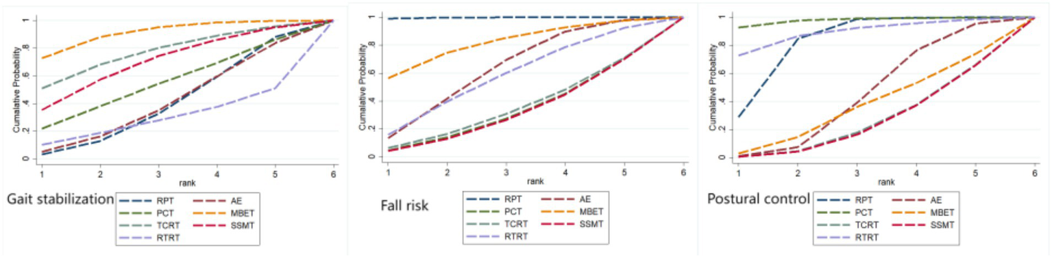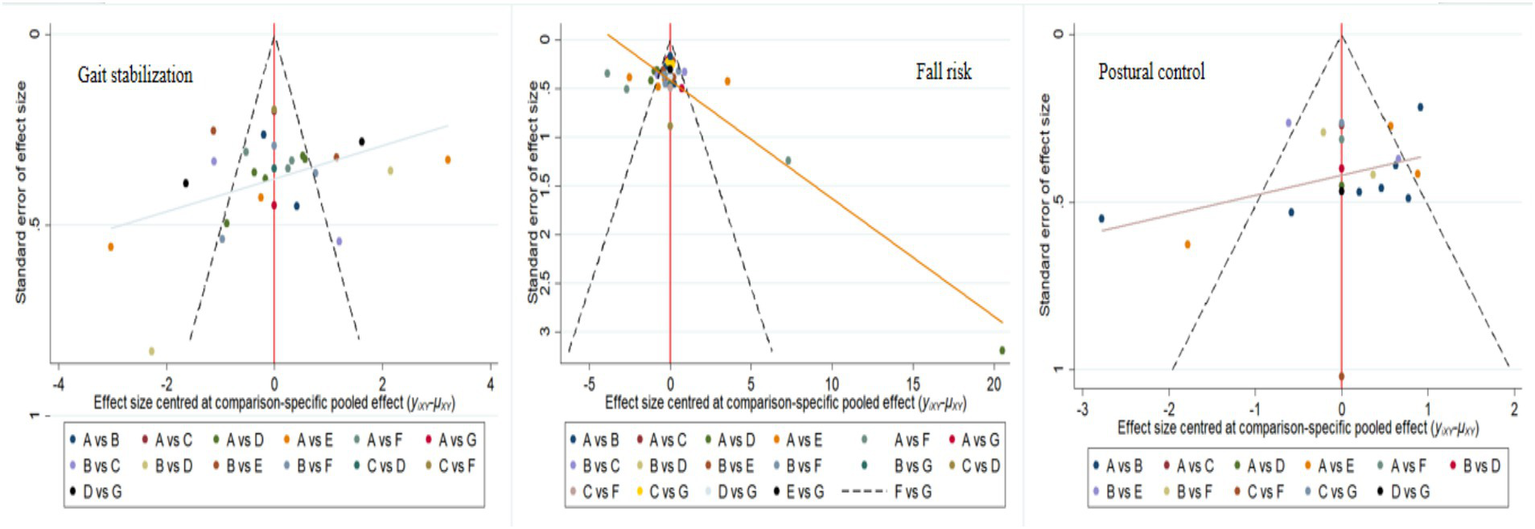 In terms of improving postural control, PCT, RTRT, and RPT performed best, with SUCRA values of 92.4, 79.3, and 69.5%, respectively. PCT directly strengthens key components of postural control through targeted training; RTRT provides a foundation for postural maintenance by enhancing muscle strength; RPT improves postural control by enhancing overall motor function through comprehensive exercise training. This outcome had the least publication bias, with relatively robust results; however, selection bias during literature screening should still be noted to avoid conclusions being skewed due to restrictions on study types or sample sizes.