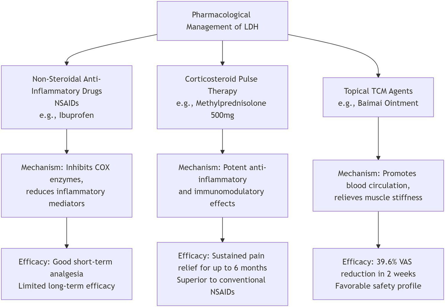 In conclusion, a stratified, phenotype-guided approach is essential for optimizing the pharmacological management of LDH (Figure 2). The therapeutic spectrum ranges from first-line NSAIDs and targeted neuropathic agents to short-term opioids, systemic steroids, and topical therapies. Future research should focus on refining this personalized framework and developing novel therapeutic agents.