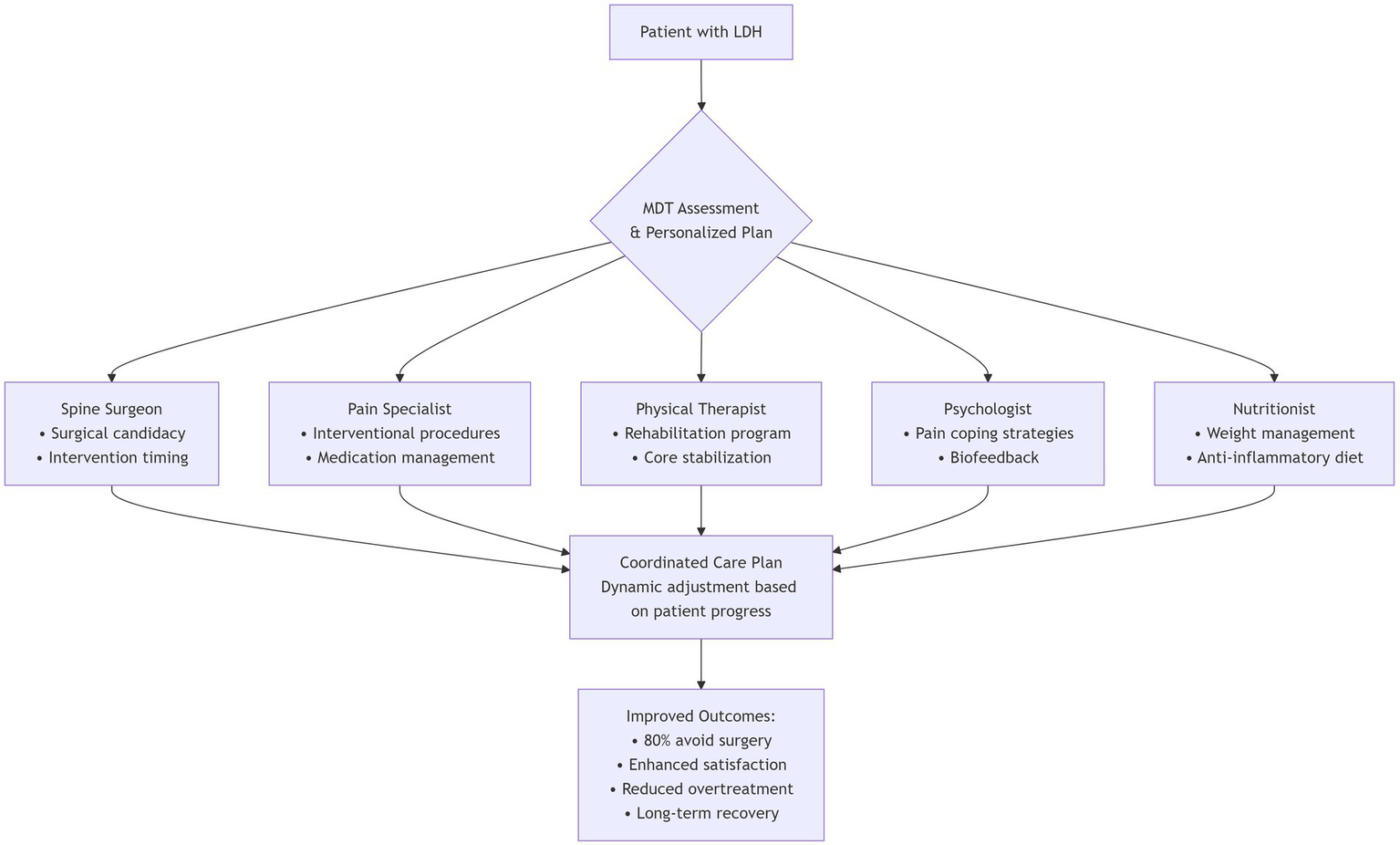 With evolving international guidelines, the management paradigm for LDH has shifted from single-modality interventions toward integrated, multidimensional strategies. Multidisciplinary team (MDT) management, incorporating evidence-based input from surgery, rehabilitation, pain medicine, psychiatry, and nutrition, is increasingly recognized as essential for tailoring dynamic, individualized treatment plans that meet diverse patient needs (Figure 4) (81, 82). MDT-based approaches have been shown to improve efficiency, enhance patient satisfaction, and reduce overtreatment and redundant investigations. One study reported that LDH patients receiving inpatient MDT-based conservative therapy achieved significantly greater pain relief and neurological improvement compared with those treated using conventional single-modality strategies. Notably, nearly 80% of patients achieved long-term recovery without requiring surgical intervention (83).