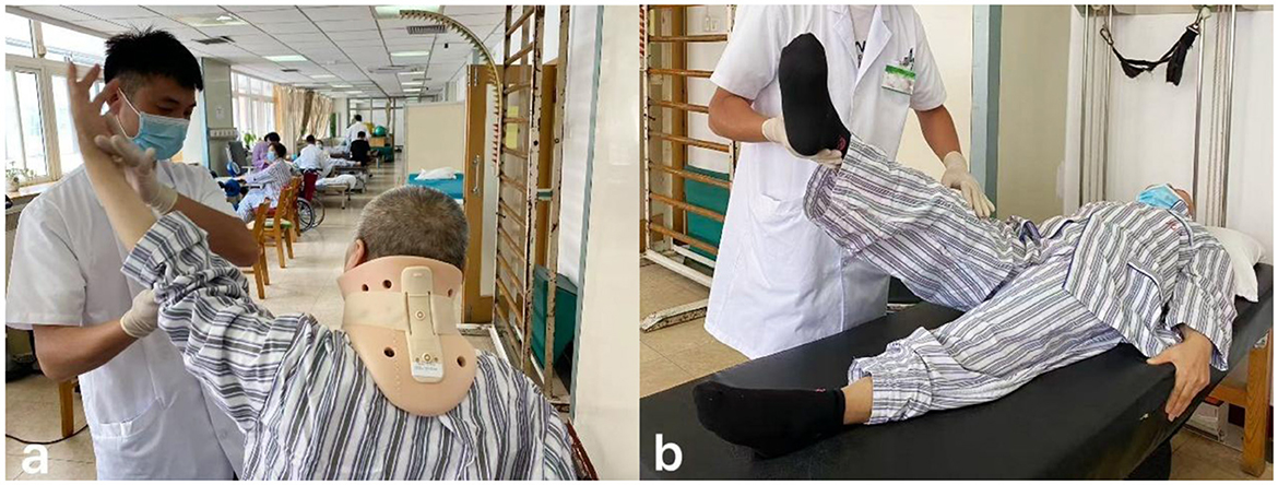 Patients received rehabilitation treatment in hospital for 7 days under the guidance of a professional team composed of rehabilitation doctors, physiotherapists, occupational therapists, and nurses. The treatment was based on Chinese expert consensus on the implementation of enhanced recovery after surgery in posterior cervical spine surgery (22). From the third day after surgery, the training was conducted for approximately 60 min each time, twice a day, and based on the patients' functional performance to adjust the exercise prescription. The nerve function training of the limbs and hands includes proprioceptive neuromuscular facilitation practices, muscle strength training and hand function training, up to 30 min at a time (Figure 1). Training on transfers, balance and gait up to 20 min at a time (Figure 2). If the neck pain was mild, perform cervical function training includes cervical range of motion training and isometric muscle strength training, the training lasts no more than 20 min (Figure 3). After the 7-day rehabilitation treatment was completed, we provided patients with a home-based rehabilitation programme that includes cervical spine function training, according to their functional impairments. Patients were discharged from the hospital and started a daily rehabilitation exercise at home.