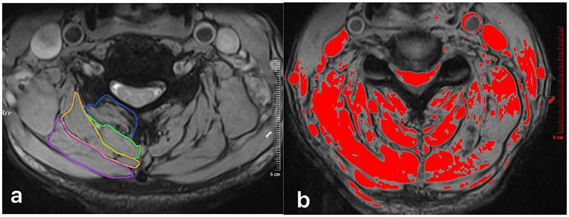 Information was extracted from the hospital's electronic medical record system and the collected patient follow-up case report forms. The data collected included: (1) basic information: gender, age, surgical segment, longest follow-up time; (2) visual analog scale (VAS) score: a total score of 10 points, with a higher score indicating more severe pain; (3) modified Japanese orthopedic association (mJOA) score: a total score of 17 points, with a higher score indicating better neurological function. This is currently a widely used evaluation index for cervical spinal cord function (23); (4) neck disability index (NDI): a total score of 50 points, with a higher score indicating worse cervical spine function, and its reliability and validity have been effectively verified (24); (5) cervical range of motion (ROM) and muscle strength: using Multi-Cervical Unit (MCU, BTE Technologies, Inc, Hanover, MD) for cervical flexion and extension ROM and isometric muscle strength tests (25, 26), recording cervical flexion ROM, extension ROM, flexion strength and extension strength (Figure 4); (6) functional cross-sectional area (fCSA) of posterior cervical muscles: patients underwent 3.0T magnetic resonance imaging (MRI, GE Signa HDxt 3.0T) before surgery, and the images were stored in the hospital's Picture Archiving and Communication System (PACS, United Imaging Medical Technology Co., Ltd., Shanghai, China). The intervertebral disc cross-sectional T2-weighted images of the C3/4, C4/5, C5/6, and C6/7 segments were downloaded to the computer, and two physicians simultaneously used the ImageJ system (Version 1.54p, National Institutes of Health, Bethesda, Maryland) for measurement, and took the average value. Four areas within the cross-sectional muscle were selected and the signal values were measured. The maximum value among them was selected as the threshold to distinguish normal muscle tissue from fat tissue. The cross-sectional areas (CSA) of the multifidus (MF), semispinalis cervicis (SC), semispinalis capitis (SCap), and splenius capitis (SpC) on both sides were obtained, and the fatty infiltration (FI) was calculated based on the measured muscle threshold, and the fCSA was calculated as fCSA = CSA × (1-FI) (27) (Figure 5).