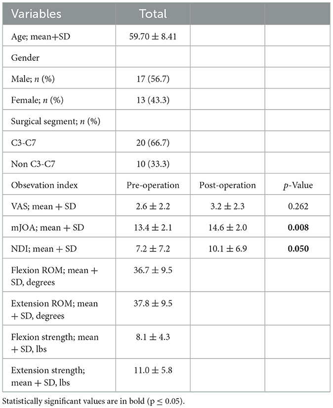 A total of 30 patients who underwent laminoplasty and received inpatient rehabilitation treatment were included in this study. No serious complications such as nerve injury, post-operative infection, or poor wound healing occurred in any of the patients during the follow-up period. The average age was 59.70 ± 8.41 years, including 17 (56.7%) male and 13 (43.3%) female. Among them, 20 (66.7%) underwent C3-C7 segment open-door laminoplasty, and 10 (33.3%) underwent non- C3-C7 segment open-door laminoplasty. Within the group there was no significant difference in the VAS scores before and 3 months after surgery (p > 0.05), while there were significant differences in the mJOA scores and NDI scores within the group before and 3 months after surgery (p ≤ 0.05). The average pre-operative cervical flexion ROM was 36.7° ± 9.5°, the extension ROM was 37.8° ± 9.5°, and the flexion muscle strength was 8.1 ± 4.3 lbs, the extension muscle strength was 11.0 ± 5.8 lbs (Table 1).