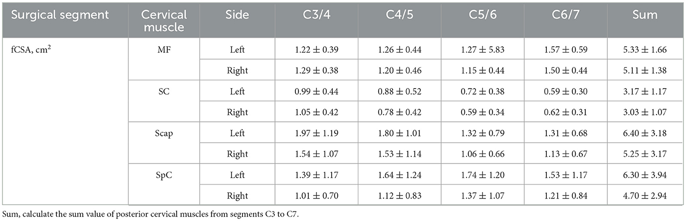 Table 2 presented the measurement values and sum values of posterior cervical muscles' fCSA on both sides of each cervical segment before surgery. The measurement of posterior cervical muscles included MF, SC, Scap, and SpC.