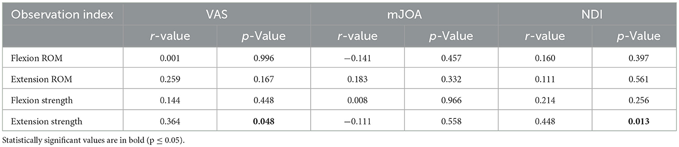 The correlation analysis showed that there was no correlation between the pre-operative cervical flexion ROM, extension ROM, flexion muscle strength and the post-operative 3-month observation indicators (p > 0.05). The pre-operative cervical extension muscle strength was weakly positively correlated with the post-operative VAS score (r = 0.364, p = 0.048) and was moderately positively correlated with the NDI score (r = 0.448, p = 0.013), however there was no correlation with the mJOA score (p > 0.05; Table 3).