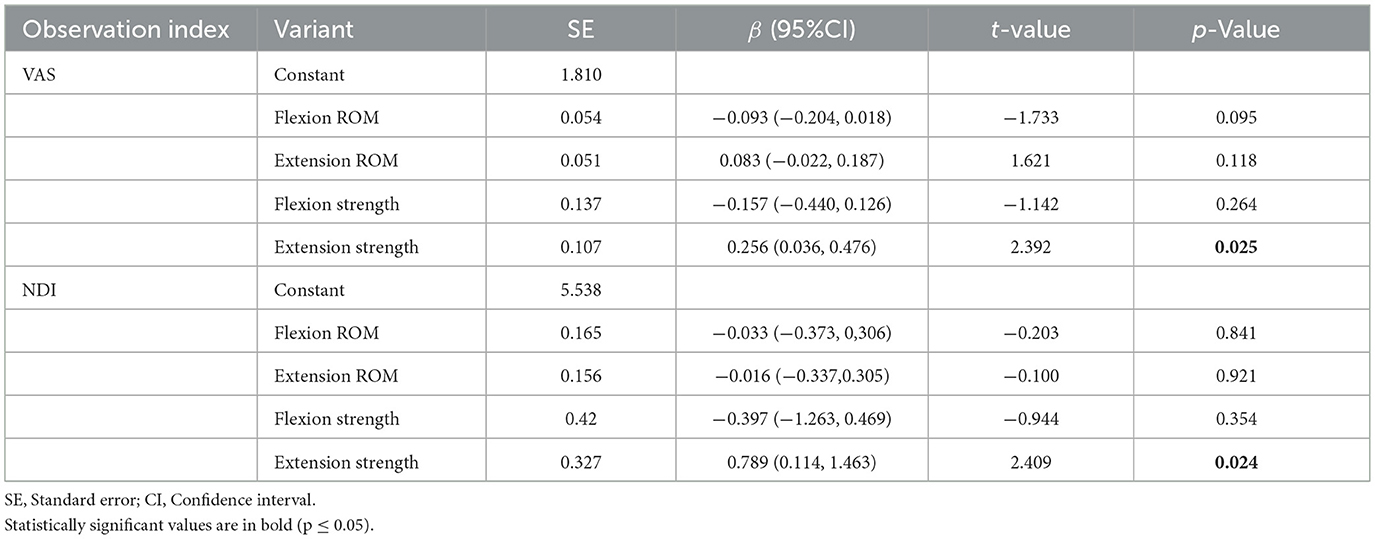 To further verify whether extension strength was an independent predictor of VAS score and NDI score, we conducted a multiple linear regression analysis. Under the condition of controlling for flexion ROM, extension ROM, and flexion strength, we evaluated the independent impact of extension strength on post-operative indicators. The regression analysis results showed that extension strength had a significant and positive independent predictive effect on post-operative VAS score (β = 0.256, p = 0.025) and NDI score (β = 0.789, p = 0.024), indicating that extension strength was a potential independent predictor of VAS score and NDI score after surgery (Table 4).