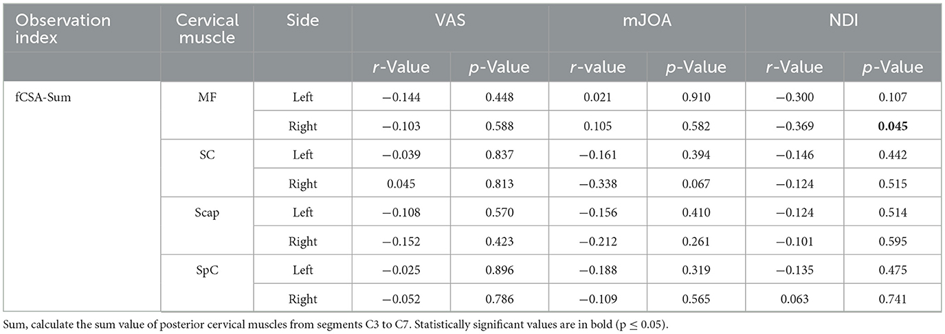 Table 5 presented the correlation analysis results between the pre-operative sum values of posterior cervical muscles' fCSA on the left and right sides and the post-operative observation indicators. The results showed that for the sum of posterior cervical muscles, pre-operative fCSA of the right MF was weakly negatively correlated with the post-operative NDI score (r = −0.369, p = 0.045). The fCSA of other posterior cervical muscles did not show a correlation with the post-operative 3-month observation indicators (p > 0.05).