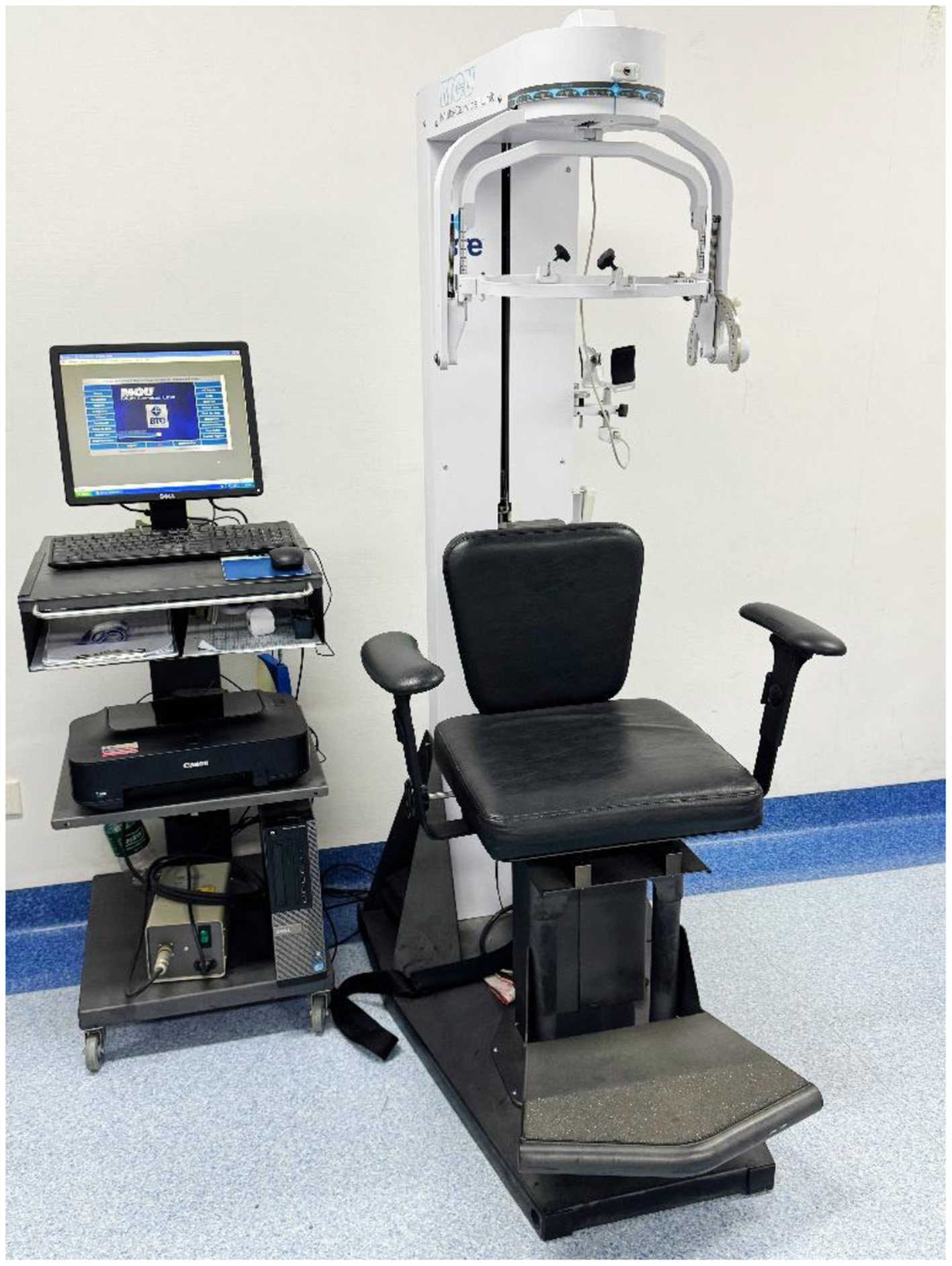 Figure 4. The Multi-Cervical Unit (MCU, BTE Technologies, Inc, Hanover, MD) is a biomechanical system designed to measuring the active range of motion of the neck and the isometric strength of neck muscles. The unit is equipped with an armchair that rotates 90° for measurement of lateral flexions, with adjustable seat height, lumbar support and armrests, and a shoulder restraint system to secure the subject within the seat in order to isolate the cervical spine during testing. It also contains a unique head assembly system (movable inner and outer head brace) designed to cause the subject's head to move safely in different planes.