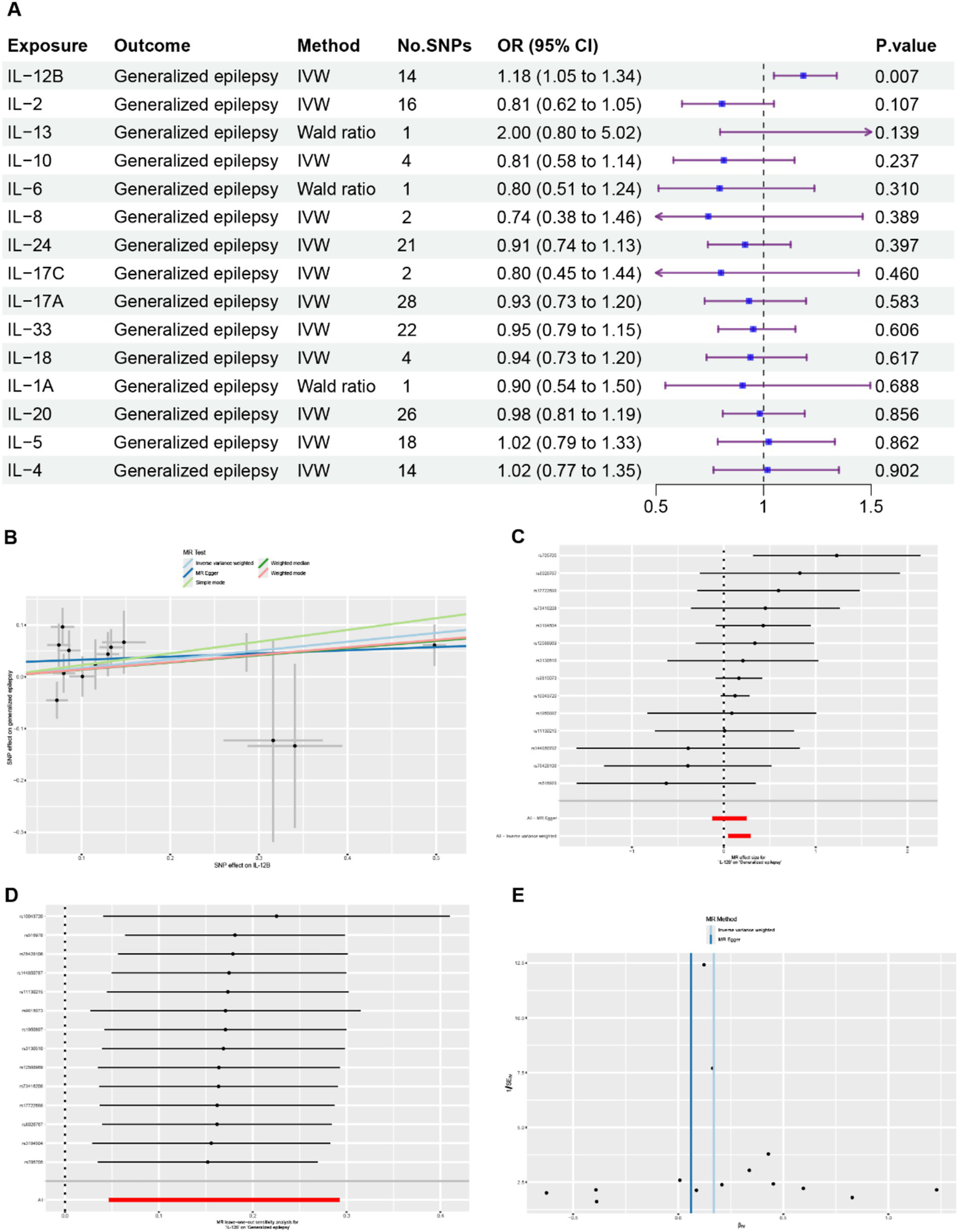 Comprehensive results of the MR analysis. (A) Causal estimates presented as odds ratios (ORs) and 95% confidence intervals for the effect of ILs on GE. (B) Scatter plots depicting the causal relationship between IL-12B and GE. (C) Detailed forest plots displaying the estimated MR effect size of IL-12B on GE. (D) Leave-one-out analysis assessing the effect of IL-12B on GE. (E) Funnel plot evaluating the potential heterogeneity between IL-12B and GE.