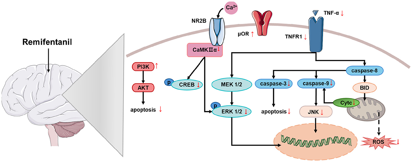 CaMKIIα, calcium-dependent protein kinase II alpha; CNS, central nervous system; CREB, cAMP response element-binding protein; ERK 1/2, extracellular signal-regulated kinase 1/2; HIBD, hypoxic-ischemic brain damage; IL-1β, interleukin-1 beta; IL-6, interleukin-6; IRI, ischemia–reperfusion injury; JNK, c-Jun N-terminal kinase; MEK1/2 (MAP2K), mitogen-activated protein kinase kinase 1/2; NE, neonatal encephalopathy; NR2B, NMDA receptor subtype 2B; OPRs, opioid receptors; PI3K, phosphoinositide 3-kinase; POCD, postoperative cognitive dysfunction; RF, remifentanil; RIH, remifentanil-induced hyperalgesia; ROS, reactive oxygen species; SCI, spinal cord injury; TBI, traumatic brain injury; TNFR1, tumor necrosis factor receptor 1; TNF-α, tumor necrosis factor-alpha.
