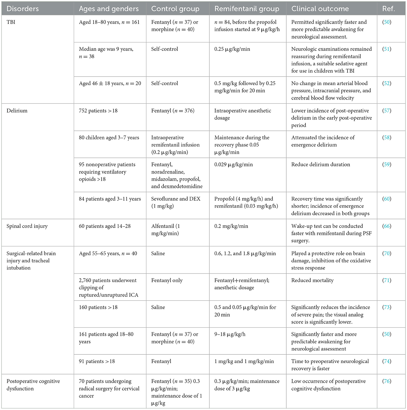 TBI refers to substantial damage to brain tissue, which can impair brain function either transiently or persistently. TBI often leads to severe neurological impairment and psychological distress, such as cognitive decline (47). The primary focus of initial TBI management is maintaining a patent airway, along with sustaining adequate ventilation, oxygenation, and blood pressure support. For patients with severe TBI, surgical intervention is frequently needed, followed by intensive postoperative monitoring and intracranial pressure surveillance. In recent years, therapeutic strategies involving pharmacotherapy for TBI have emerged as a research focus, aiming to enhance cognitive and neurological function recovery through neuroprotection and neural restoration (48). Endogenous opioids are considered to play a role in the pathophysiology of TBI, and the administration of opioids can influence brain injury and provide neuroprotection following TBI (49). A study conducted by Karabinis et al. (50) revealed that in patients with acute brain injury or those intubated post-neurosurgery, the administration of RF significantly shortened the time required for neurological assessment (P < 0.001 vs. fentanyl and morphine), and the extubation rate was notably faster than that in the morphine-treated group. These findings indicate that RF has superior analgesia-based sedative effects and enables more rapid awakening for neurological evaluation. Another study similarly demonstrated that in pediatric patients hospitalized due to TBI, continuous infusion of RF (at a median dose of 0.25 μg/kg/min) achieved target levels of sedation scores and neurological status, suggesting that RF can provide sedation with rapid onset and facilitate prompt recovery (51). A study by Engelhard et al. (52) also indicated that when used as an analgesic in TBI patients, RF did not exert adverse effects on cerebrovascular hemodynamics, cerebral perfusion pressure, or intracranial pressure. Collectively, these findings suggest that continuous RF infusion constitutes a safe and effective analgesic regimen for TBI patients or other patients intubated postneurosurgery. Moreover, RF has significant advantages in neurological assessment within clinical settings. In the future, developing an RF-centered analgesic regimen for TBI is promising, thereby enabling earlier intervention and improving the long-term neurological prognosis of patients (Table 2).