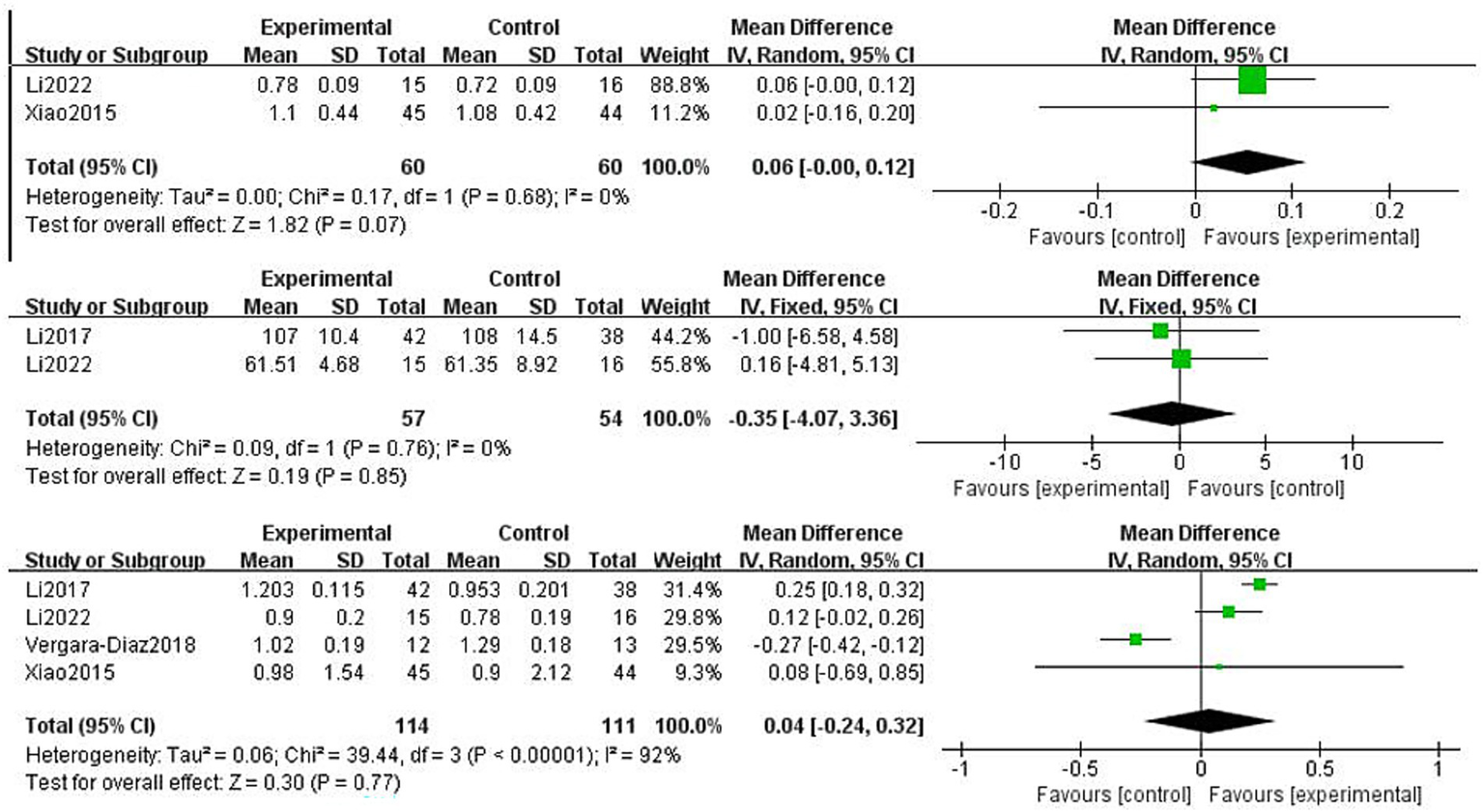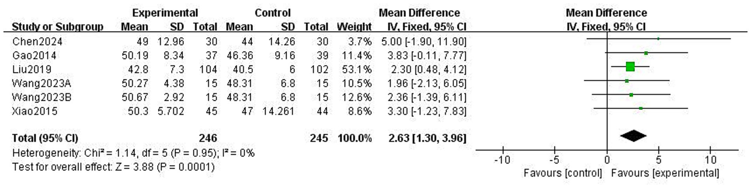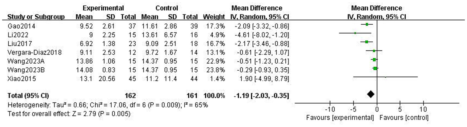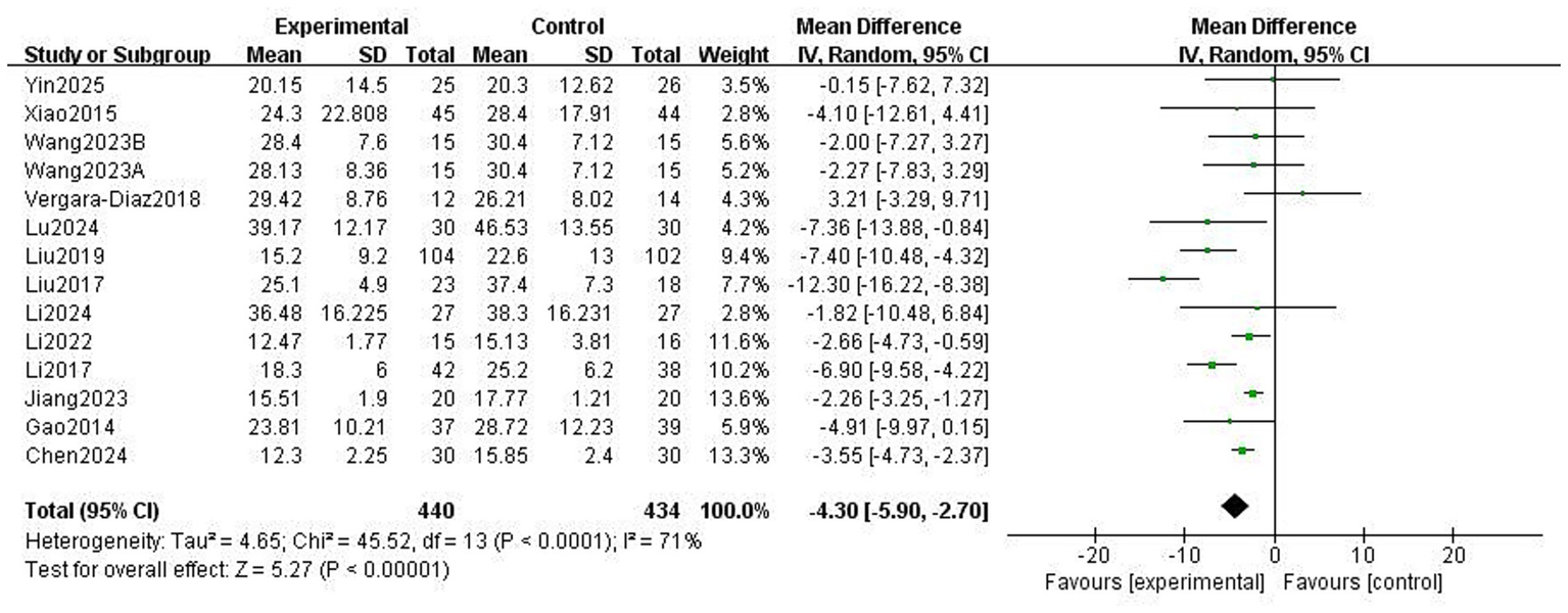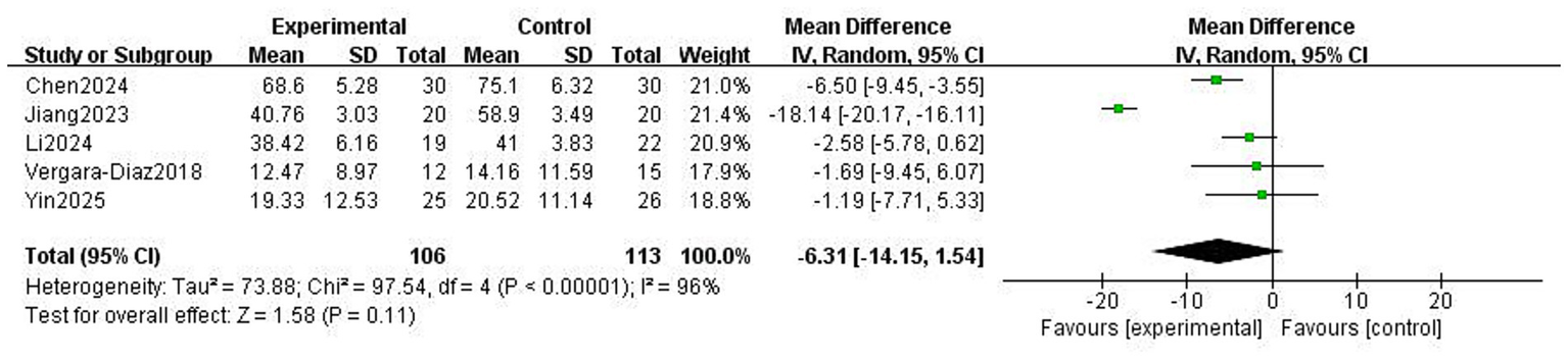 ![Forest plot displaying the mean differences with 95% confidence intervals for five studies comparing experimental and control groups. Studies listed are Chen2024, Jiang2023, Li2024, Vergara-Diaz2018, and Yin2025. The overall mean difference is -6.31, with a confidence interval of [-14.15, 1.54]. The plot indicates heterogeneity with I-squared at 96%. The diamond at the bottom represents the combined effect size favoring the experimental group.](https://www.frontiersin.org/files/Articles/1708466/xml-images/fneur-16-1708466-g014.webp)