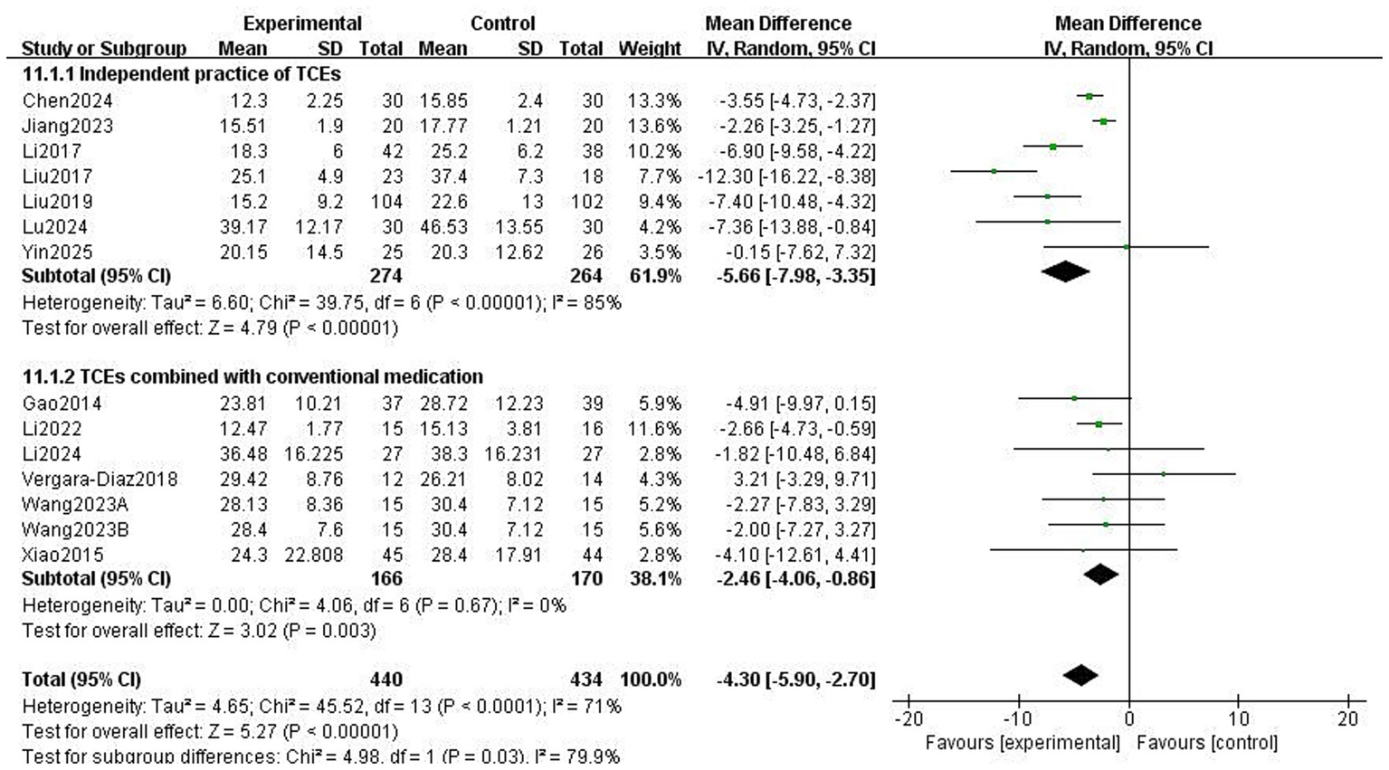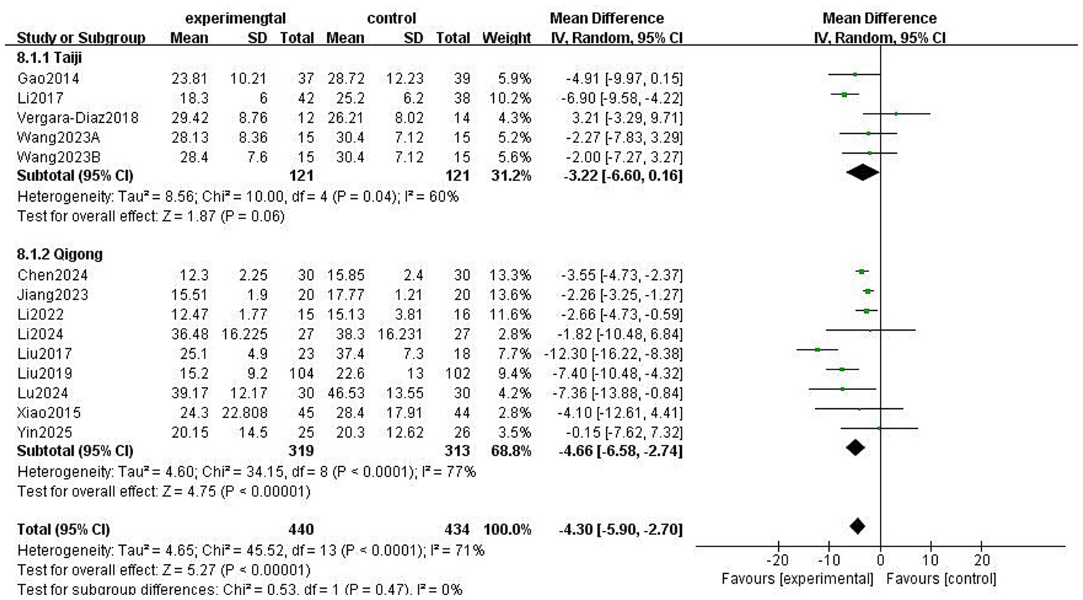 The Unified Parkinson’s Disease Rating Scale Part III (UPDRS-III) is a standard clinical test for assessing the severity of motor complications in patients with PD, with a higher score indicating more severe motor complications (25). A total of 859 patients from 13 RCTs used UPDRS-III to evaluate motor function. The meta-analysis results showed that the UPDRS-III scores in the Traditional Chinese exercises (TCEs) intervention group were significantly lower than those in the control group (MD: −4.30, 95% CI: −5.90, −2.70, p < 0.00001), indicating a significant improvement in motor function. The heterogeneity among the studies was high (I2 = 71%). After sensitivity analysis, the heterogeneity significantly decreased to 53% when the study by Liu et al. (15) was excluded; however, the overall effect size remained unchanged (Figure 3). Subgroup analysis based on exercise type (Figure 4) showed that Tai Chi (MD: −3.22, 95% CI: −6.60 to 0.16, p = 0.06, I2 = 60%) and Qigong (MD: −4.66, 95% CI: −6.58 to −2.74, p < 0.00001, I2 = 77%) were analysed. The results indicated that Qigong significantly improved motor symptoms in patients with PD (p < 0.05). Subgroup analysis based on exercise duration (Figure 5) showed that ≤12 weeks (MD: −4.25, 95% CI: −6.15 to −2.35, p < 0.0001, I2 = 75%) and > 12 weeks (MD: −4.03, 95% CI: −7.03 to −1.03, p = 0.008, I2 = 60%) were analysed. The results indicated that an exercise duration of ≤12 weeks provided greater improvement in motor function for PD patients. Subgroup analysis based on exercise frequency (Figure 6) showed that ≤3 times (MD: −3.22, 95% CI: −6.60 to 0.16, p = 0.06, I2 = 60%) and >3 times per week (MD: −4.66, 95% CI: −6.58 to −2.74, p < 0.00001, I2 = 77%) were analysed. The results indicated that exercising > 3 times/week resulted in better motor improvements. Subgroup analysis based on the intervention method (Figure 7) showed that the independent practise of TCEs (MD: −5.66, 95% CI: −7.98, −3.35, p < 0.00001, I2 = 85%) and TCEs combined with conventional medication (MD: −2.46, 95% CI: −4.06, −0.86, p = 0.003, I2 = 0%) were analysed. The results indicated that independent practise of TCEs was more effective in improving mobility and reducing the risk of falls for PD patients with PD.