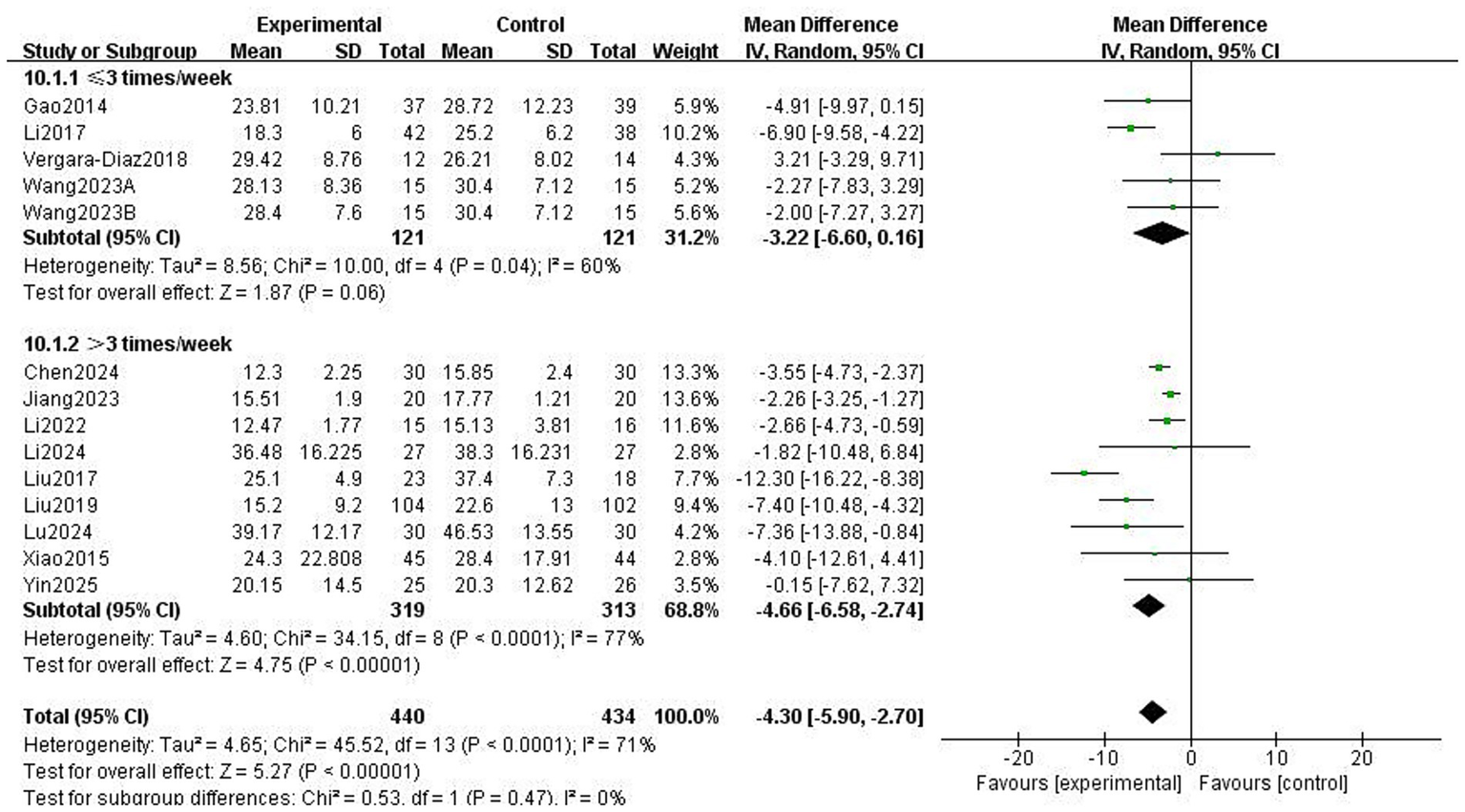 ![Forest plot showing the mean difference between experimental and control groups for studies conducted less than or more than three times per week. Subtotals and total are provided with 95% confidence intervals. Heterogeneity is indicated with Tau², Chi², and I² statistics. The plot suggests a favor towards the experimental group with an overall mean difference of -1.19 [-2.03, -0.35]. Data points with confidence intervals are visually represented.](https://www.frontiersin.org/files/Articles/1708466/xml-images/fneur-16-1708466-g012.webp)