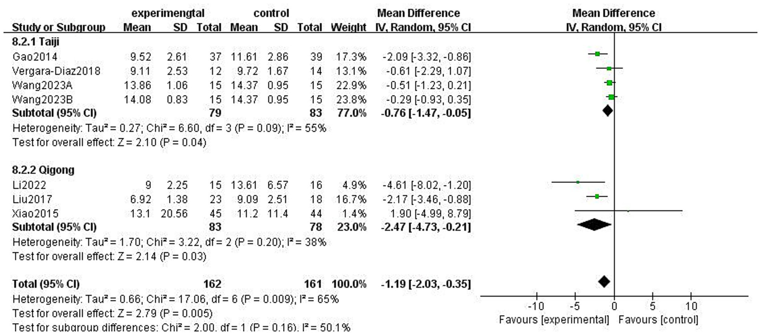 This study used the Berg Balance scale (BBS) and the Timed Up and Go Test (TUGT) to evaluate balance function in patients with PD; both scales assess balance-related abilities but measure different aspects of functional stability. The BBS is used to assess functional balance and shows high validity and reliability in patients with PD, with a higher score indicating better balance. The Timed Up and Go Test (TUGT) is generally used to assess the risk of walking and falling in patients with PD, with a higher score indicating a higher risk. Meta-analysis data from five studies involving 476 patients utilised the BBS (Figure 8). Data using a fixed-effects model showed that TCEs significantly improved patients’ balance ability (MD: 2.63, 95% CI: 1.30 to 3.96, p = 0.0001, I2 = 0%). Six studies, involving 308 patients, used the TUGT scale. Data from a random-effects model (Figure 9) showed that the completion time for the intervention group was significantly reduced (MD: −1.19, 95% CI: −2.03, −0.35, p = 0.005, I2 = 65%), indicating that TCEs significantly improved mobility and reduced the risk of falls in patients with PD. Although this analysis had high heterogeneity (I2 = 65%), the sensitivity analysis revealed that heterogeneity decreased to 28% after excluding the studies by Wang et al. (18), and the conclusion remained significant. Subgroup analysis (Figures 10–12) showed that Tai Chi (MD: −0.76, 95% CI: −1.47 to −0.05, p = 0.04, I2 = 55%) and Qigong (MD: −2.47, 95% CI: −4.73 to −0.21, p = 0.03, I2 = 38%) were analysed. The results indicate that qigong provided better improvements in mobility and fall risk for patients with PD. For exercise duration, ≤12 weeks (MD: −2.29, 95% CI: −3.15 to −1.42, p < 0.00001, I2 = 0%) and >12 weeks (MD: −0.39, 95% CI: −0.85 to −0.07, p = 0.09, I2 = 0%) were analysed. The results showed that ≤12 weeks yielded a significant and stable effect on mobility and fall risk in PD patients. For exercise frequency, ≤3 times (MD: −0.76, 95% CI: −1.47 to −0.05, p = 0.04, I2 = 55%) and >3 times per week (MD: −2.47, 95% CI: −4.73 to −0.21, p = 0.03, I2 = 38%) were analysed. The results indicated that exercising >3 times per week was more effective in improving mobility and fall risk of patients with PD.