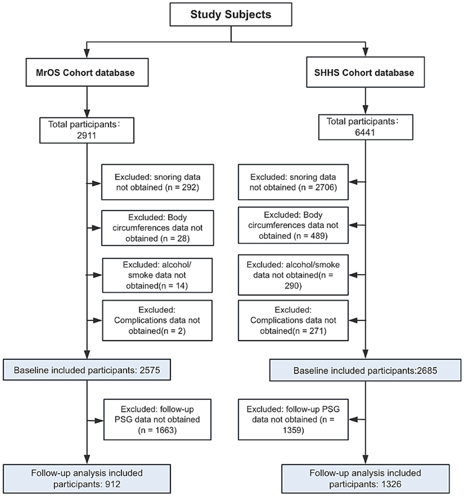 A total of 2,575 participants who met the inclusion criteria from the MrOS were included in this study. Of these, 232were classified as non-OSA, 906 as mild OSA, 766 as moderate OSA, and 635 as severe OSA (Table 1). 2,685 participants from the SHHS who fulfilled the inclusion criteria were included. Among them, 372 were classified as non-OSA, 972 as mild OSA, 834 as moderate OSA, and 530 as severe OSA (Table 2). The participant selection process for both the MrOS and SHHS databases is illustrated in Figure 1, detailing the sequential exclusion criteria. Ultimately, 2,575 participants from MrOS and 2,685 participants from SHHS were included in the final analysis. Follow-up PSG was obtained in 912 MrOS participants and 1,326 SHHS participants, who were included in the follow-up analyses. The full inclusion and exclusion flowchart for both cohorts are shown in Figure 1.