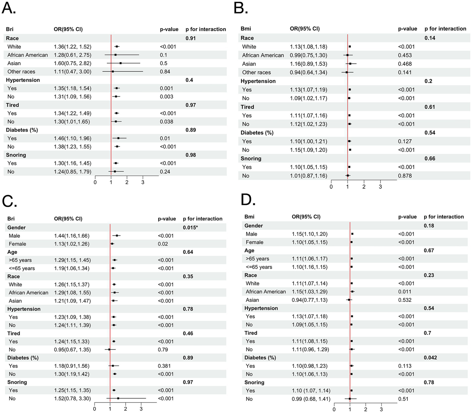 To assess the association between the BRI, BMI, and baseline severe OSA, we constructed three logistic regression models with progressively increasing levels of covariate adjustment: Model 1 was unadjusted. Model 2 was further adjusted for age, race/ethnicity, gender, snore. Model 3 incorporated additional variables, including age, race/ethnicity, gender, neck circumference, snoring, tiredness, smoking status, alcohol use, hypertension, and history of diabetes (23). This consistent stepwise adjustment strategy was designed to control for potential confounders and to assess the robustness and power of the anthropometric indices across different modeling approaches. Subgroup analyses were conducted by stratifying the population based on gender, age, and other key variables.