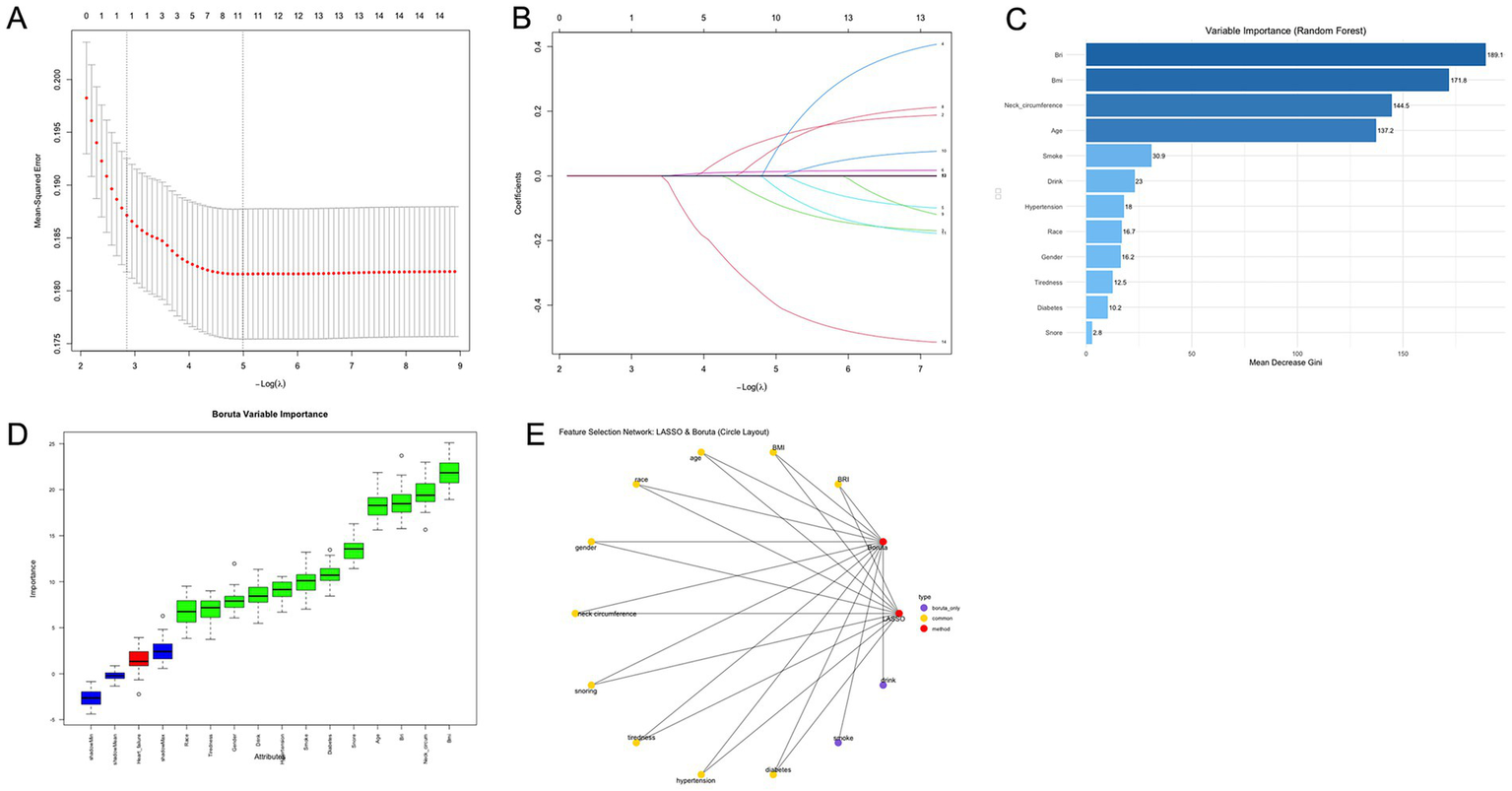 Covariates included in Models 1, 2, and 3 were selected based on prior clinical relevance and were further informed by feature importance analyses using LASSO regression and the Boruta algorithm. Feature selection was performed using the SHHS cohort, which has a larger and more comprehensive dataset with both sexes. Selected variables were used to develop and validate models separately in SHHS and MrOS to assess external generalizability. This approach ensured that the choice of adjustment variables was systematic and data-driven rather than arbitrary.