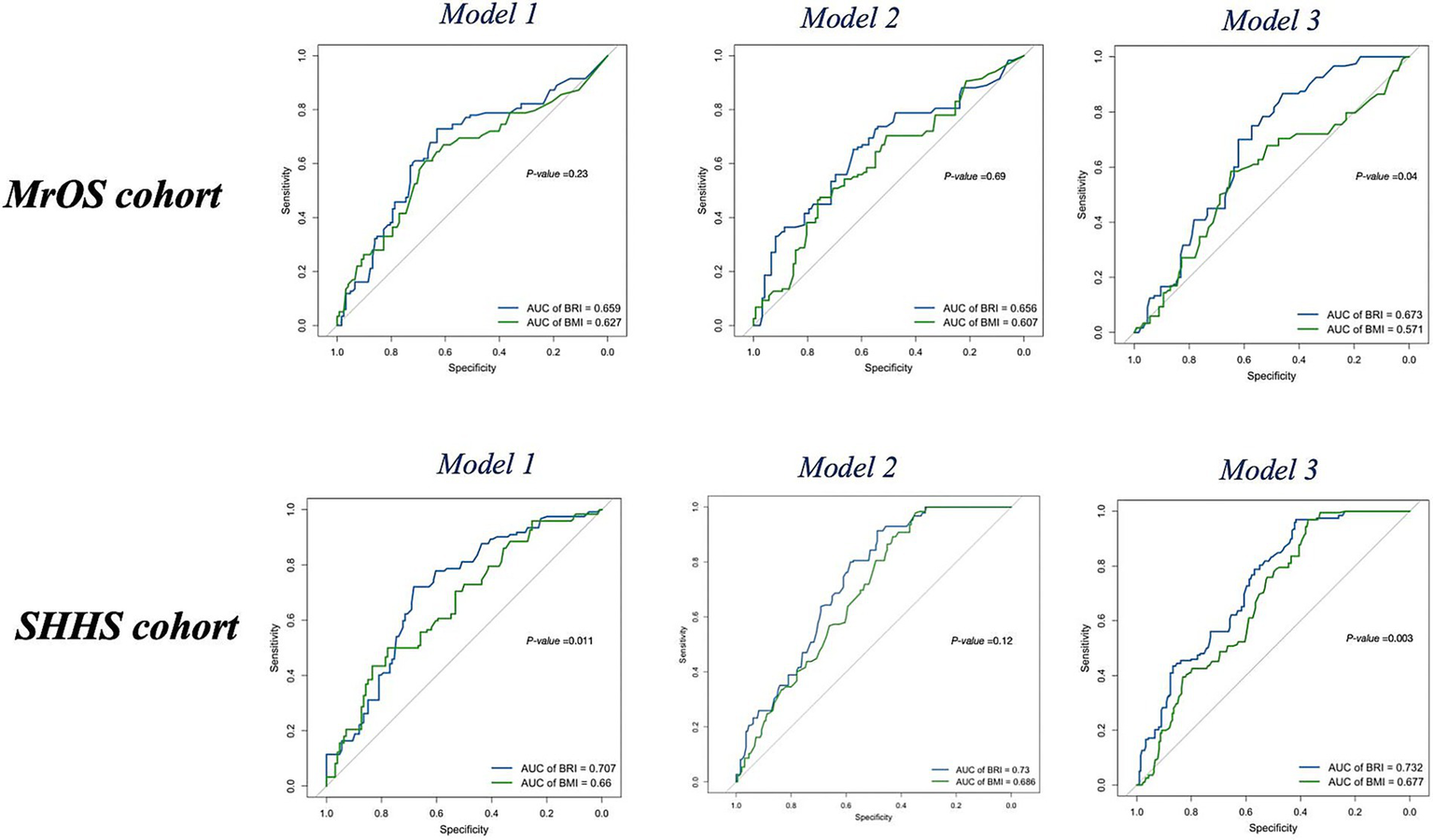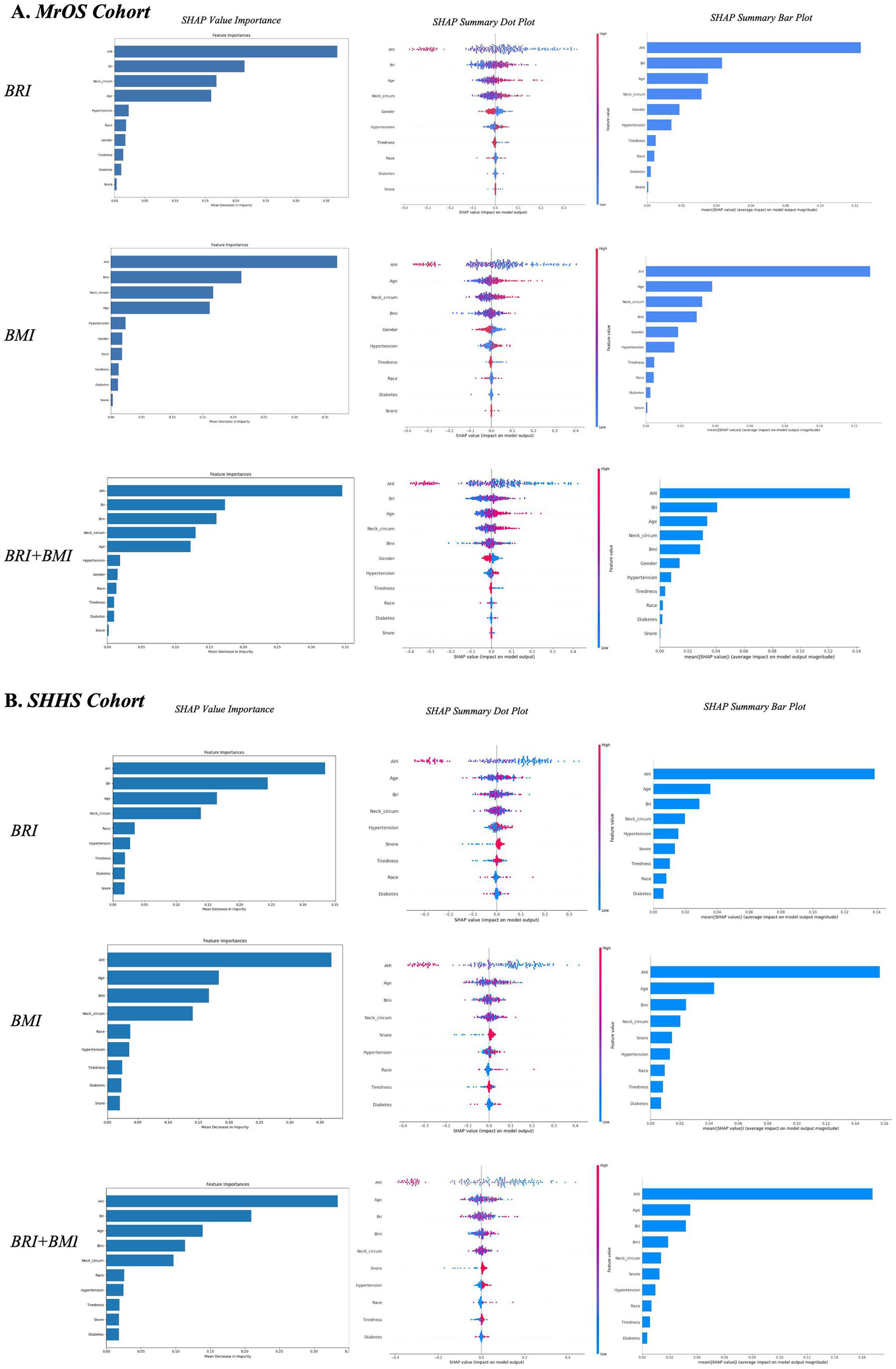 BRI showed stronger associations with severe baseline OSA than BMI in both cohorts (MrOS: OR = 1.50 vs. 1.22, SHHS: OR = 1.21 vs. 1.12). BRI demonstrated significant dose–response trends across quartiles, while BMI was only significant in the highest quartile. RCS analyses indicated linear relationships between both BRI, BMI, with severe baseline OSA. A significant sex interaction was observed (P for interaction = 0.015), with a stronger association in men (OR = 1.44, 95% CI: 1.16–1.66) than in women (OR = 1.13, 95% CI: 1.02–1.26). Random forest models using baseline features showed higher AUCs for BRI than BMI in assessing worsening of follow-up OSA severity (MrOS: 0.67 vs. 0.57, p < 0.05, SHHS: 0.73 vs. 0.68, p < 0.01). SHAP interpretation confirmed BRI as a superior feature, with greater feature contribution than BMI.