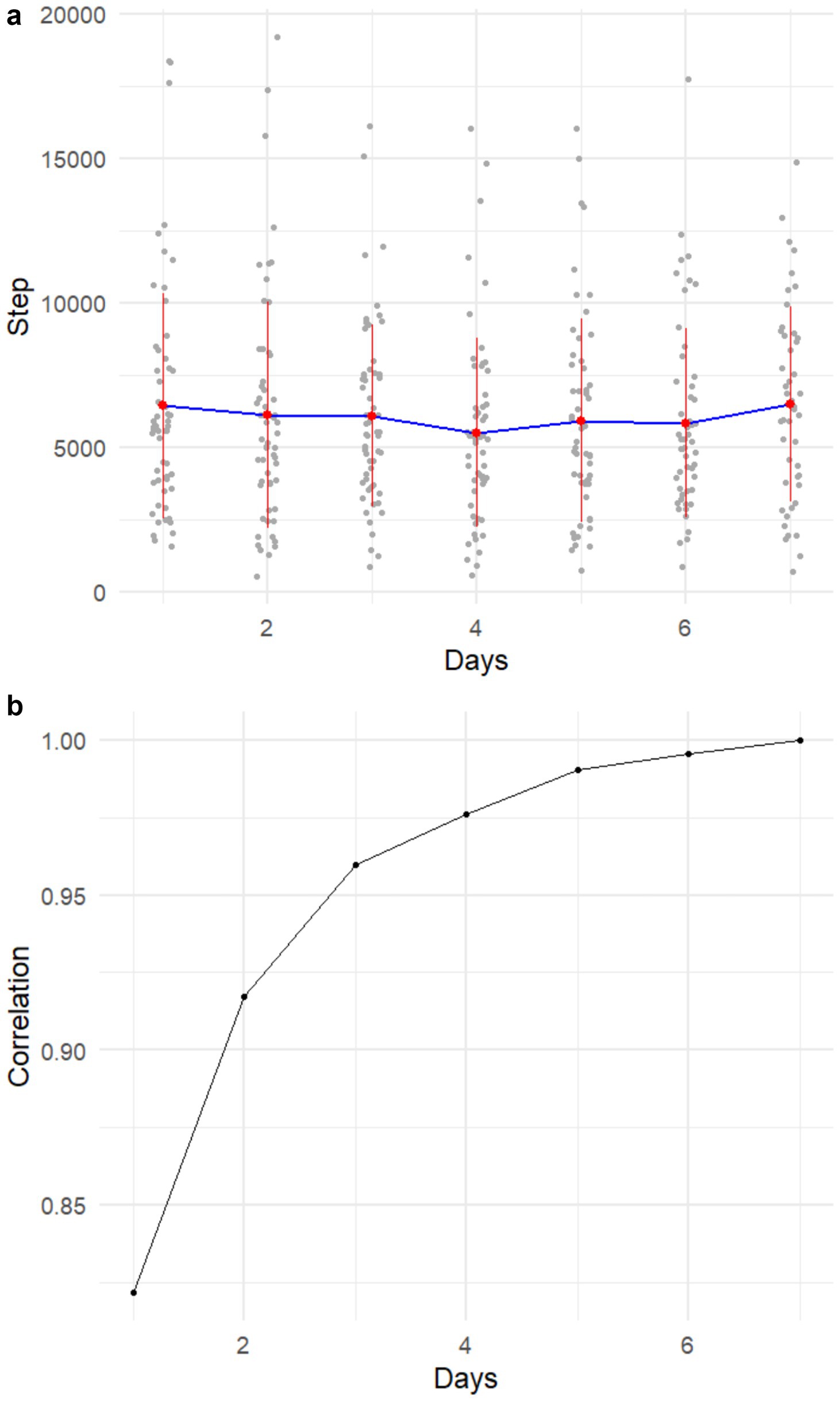 Figure 3. (a) Average daily step counts per day across all subjects. (b) Pearson correlations between the average daily step count of successive days and the average step count of the 7-day period.