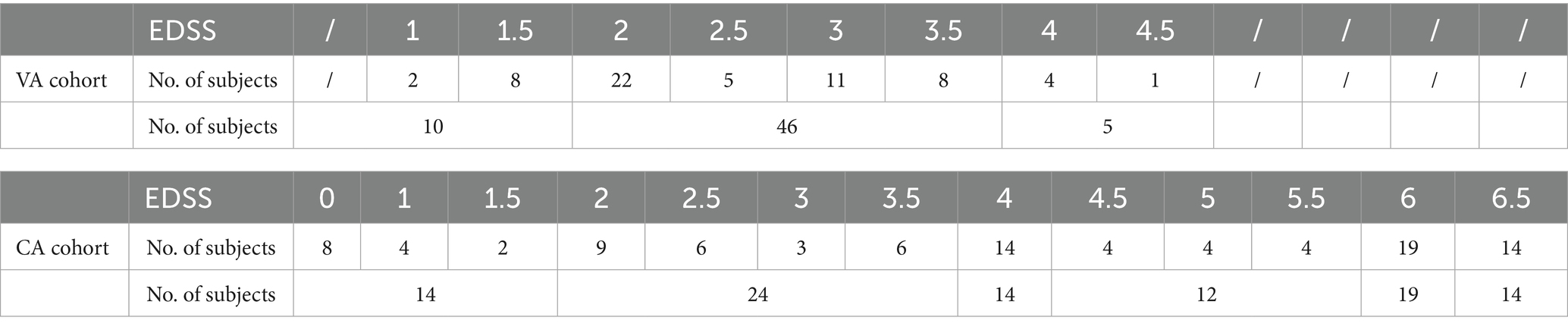 A total of 61 of the MS participants in the VA cohort had an EDSS score and step count data and the distribution is shown in Table 1. Overall, this cohort had relatively lower disability measured by EDSS (aligned with the inclusion criteria), with one participant having the highest EDSS of 4.5. This is different from the CA cohort (97 participants with MS had both EDSS and step count data), where 48% of the cohort had an EDSS no less than 4.5, indicating that they had more MS related neurologic disability.