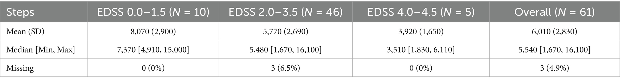 In the VA cohort, step count variability was greatest in the lower EDSS range (0–1.5; SD 2,900 steps, range 4,910–15,000) and lowest in the EDSS 3.5–4.5 group (SD 1,650 steps, range 1,830–6,110). This pattern is consistent with the findings from CA cohort, which observed a wider step count range among participants with lower disability (EDSS: 0–1.5; 2,286–18,648 steps per day) and decreasing variability with higher EDSS scores. However, the VA cohort included only 5 participants in the higher EDSS range (4.0–4.5), limiting interpretation of variability in the higher disability (EDSS) groups (see Figure 1; Table 2).