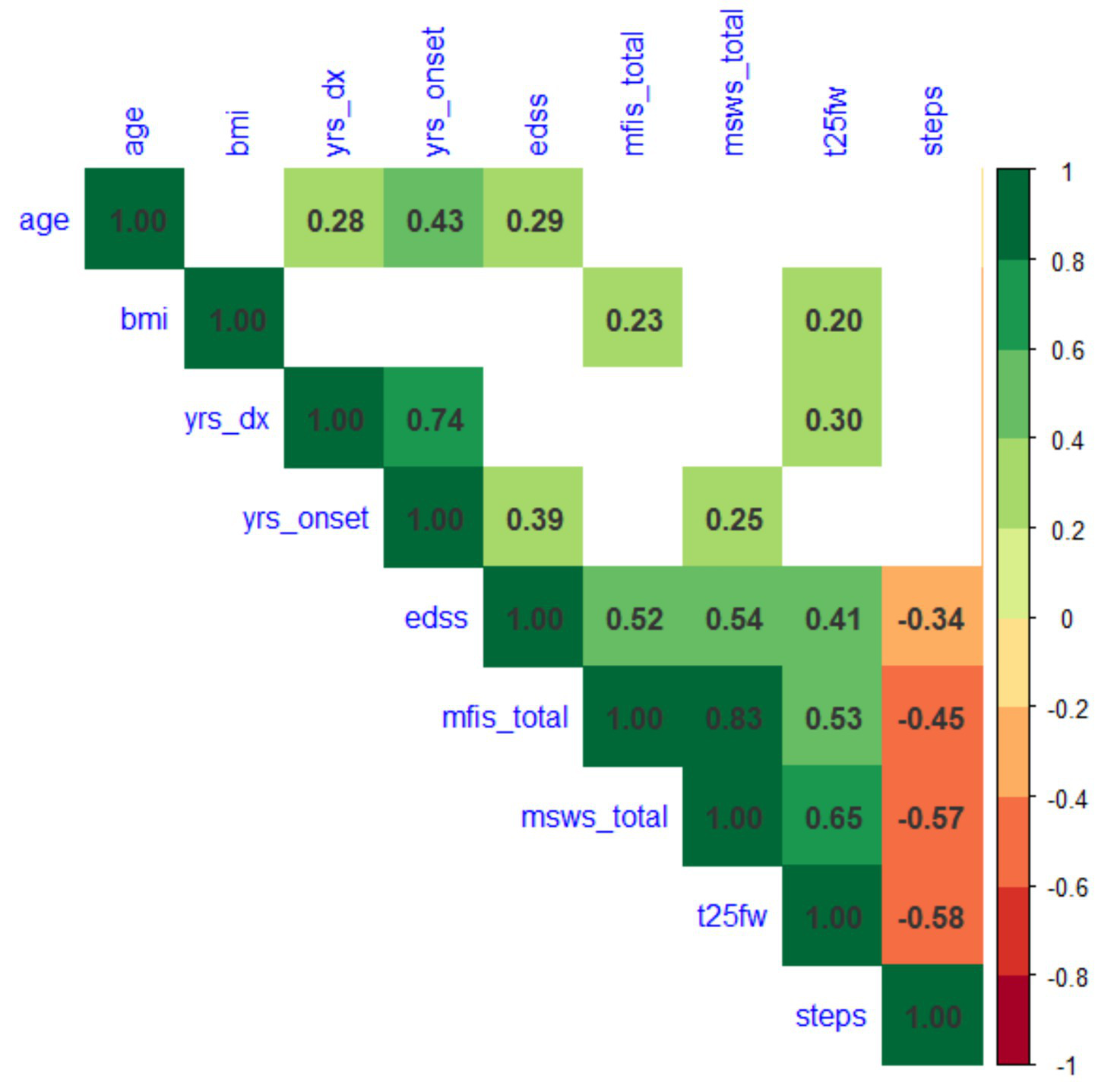 Spearman correlations between MSFC, EDSS and steps in VA cohort are shown in Figure 2, with blank cells indicating the correlations are not significant (p > 0.05). Steps are significantly associated with walking outcomes with strongest correlation with T25FW (r = −0.58, p < 0.0001), followed by MSWS (r = −0.57, p < 0.0001), and MFIS (r = −0.45, p < 0.0001). This is comparable to the CA cohort findings: using Spearman’s correlations, wherein average daily step counts were strongly associated with T25FW (r = −0.65, p < 0.001), MSWS scores (r = −0.65, p < 0.001) and MFIS (r = −0.41, p < 0.01).