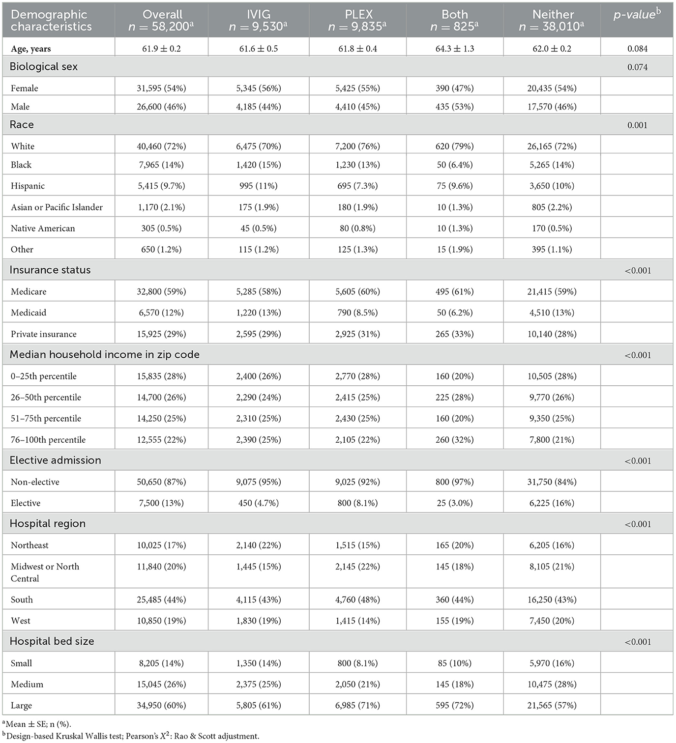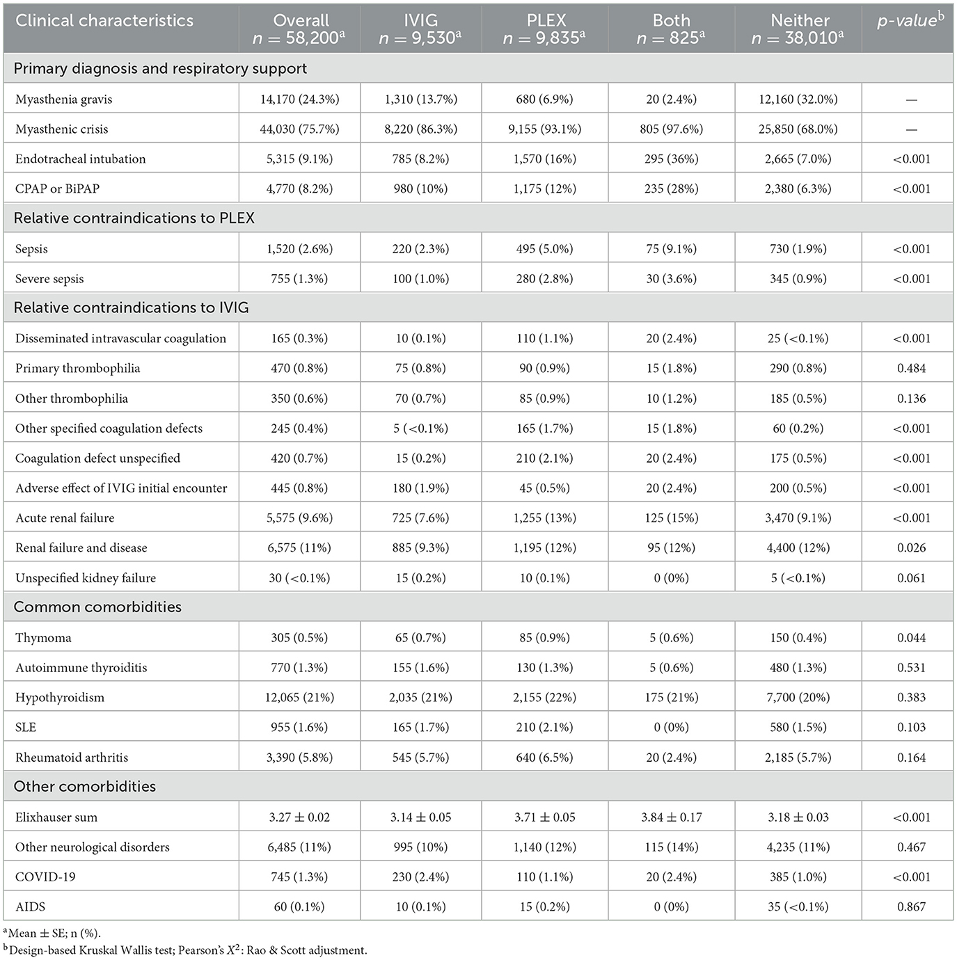 Additionally, there were a few notable significant differences in baseline clinical characteristics, including Elixhauser sum (both 3.84 ± 0.17; neither 3.18 ± 0.03; p < 0.001), sepsis (IVIG 220 (2.3%); both 75 (9.1%); overall 1,520 (2.6%); p < 0.001), disseminated intravascular coagulation (PLEX 110 (1.1%); both 20 (2.4%); overall 165 (0.3%); p < 0.001), and acute renal disease (PLEX 1,255 (13%); both 125 (15%); overall 5,575 (9.6%); p < 0.001) (Table 2).