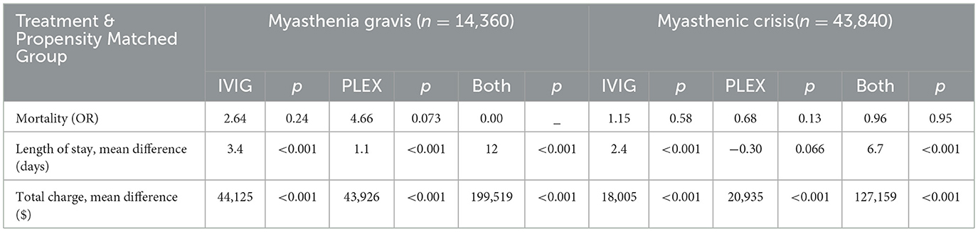 Methods: Myasthenia gravis and crisis admissions from 2017 to 2022 were collected using the National Inpatient Sample. Admissions were categorized by treatment: IVIG, PLEX, both, or neither. To minimize selection bias, admissions were propensity-matched for IVIG and PLEX. Differences in mortality were evaluated using logistic regression models. Length of stay and inflation-adjusted total charge were assessed using linear regression models.