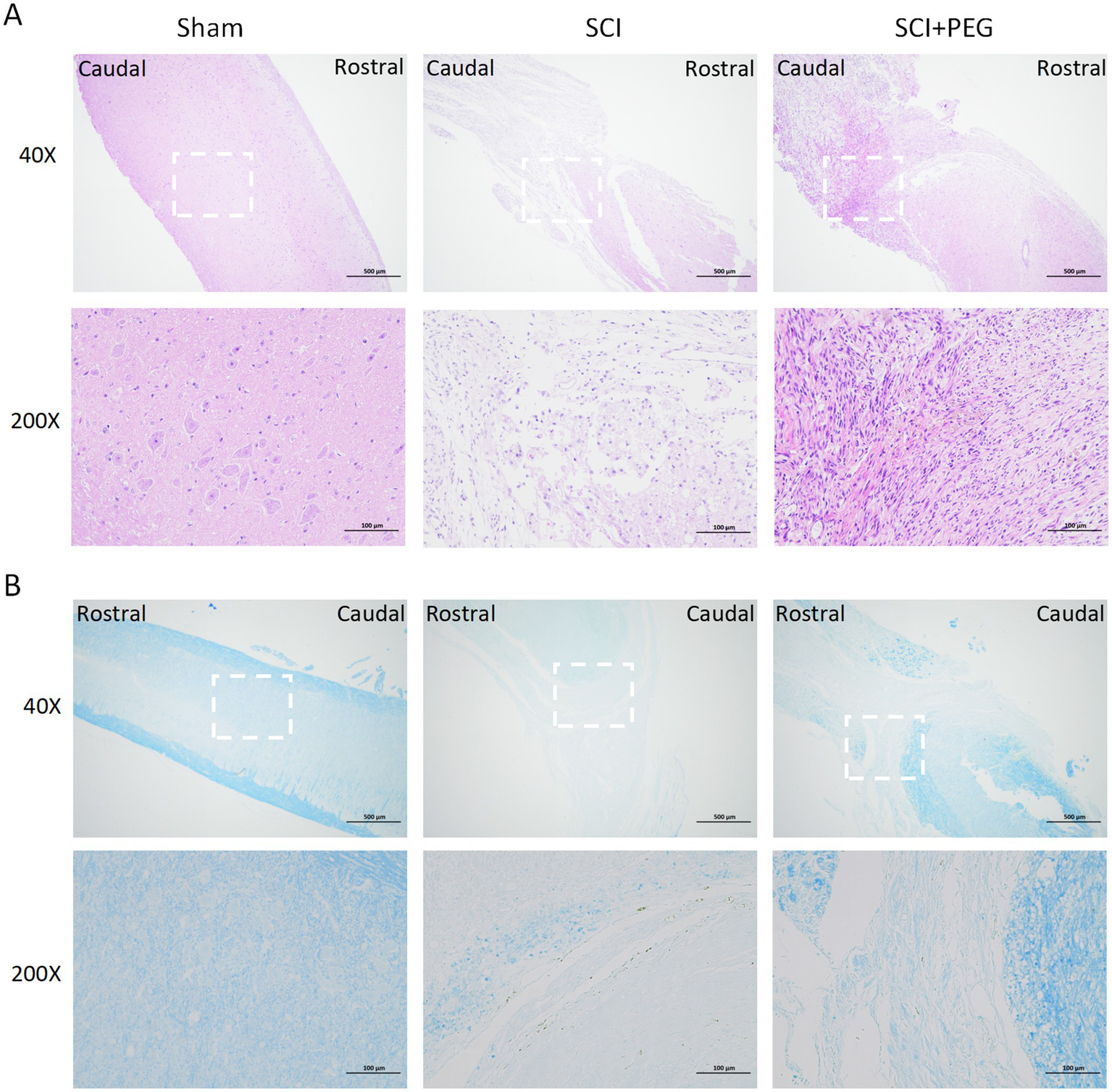 Figure 2. PEG improves the pathological injury of SCI mice spinal cord. (A) Results of HE staining of a longitudinal section of the spinal cord in each group 28 days after SCI. n = 5/group. (B) Results of LFB staining of a longitudinal section of the spinal cord in each group 28 days after SCI. The deeper the staining result, the more complete the myelin structure. n = 5/group. Scale bar: 500 μm (inset: higher magnification; scale bar: 100 μm).